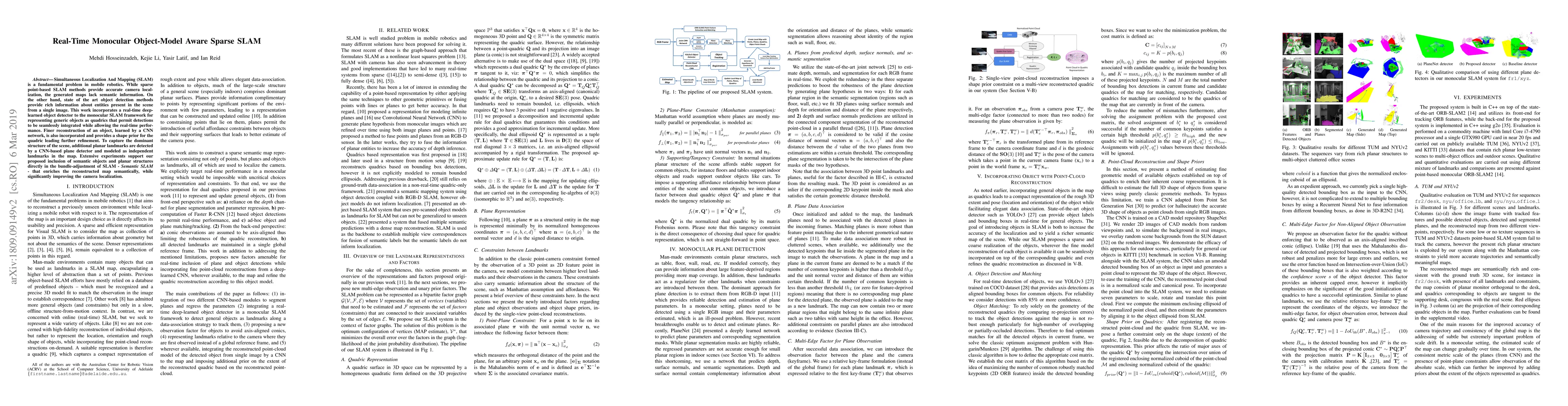 This paper proposes a real-time monocular SLAM system that integrates semantic object and planar structure information using deep learning for enhanced localization and map enrichment. The method combines object detection and CNN-based plane detection to model objects as quadrics and planar landmarks, improving both map accuracy and localization.