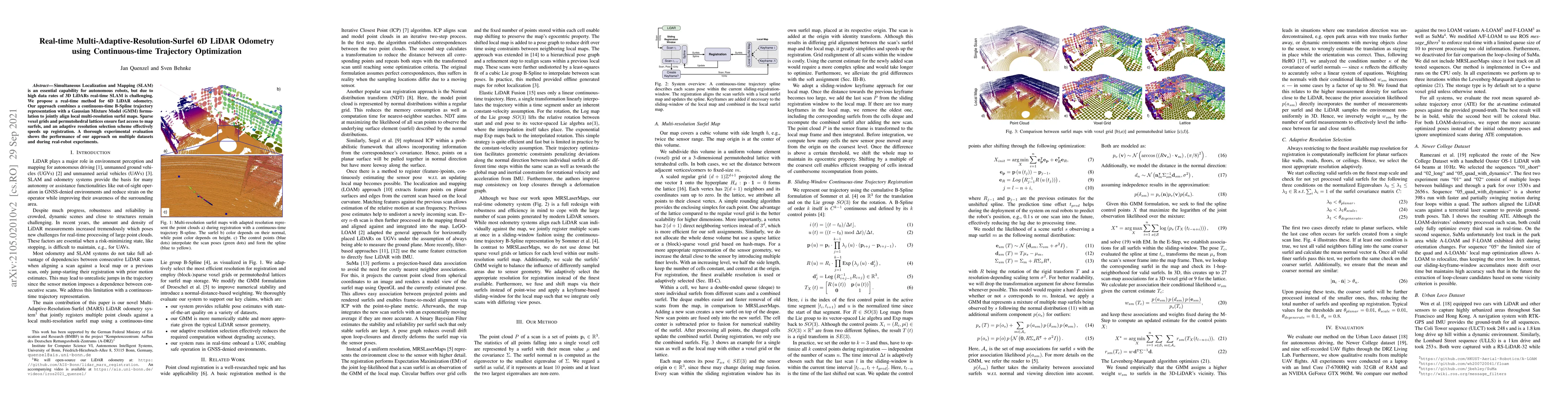 This paper proposes a real-time 6D LiDAR odometry method for SLAM using continuous-time trajectory optimization. It combines B-Spline representations with Gaussian Mixture Models for multi-resolution surfel map alignment, optimizing registration speed with adaptive resolution and efficient data structures.