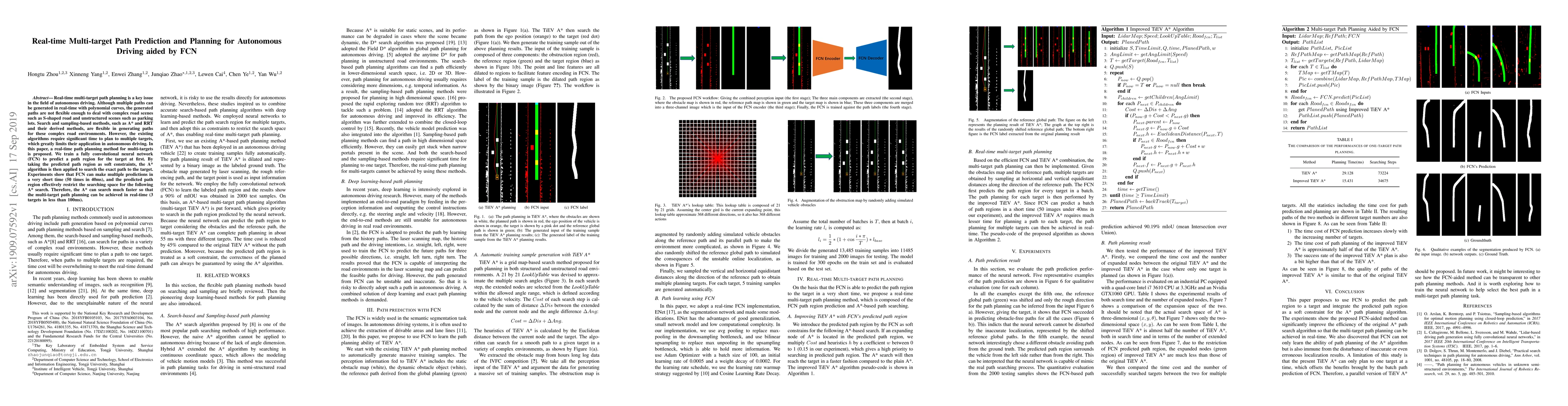 This paper proposes a real-time multi-target path planning method for autonomous driving using a fully convolutional neural network (FCN) to predict path regions, which then guides the A* algorithm for faster path search. The FCN enables rapid predictions, allowing real-time multi-target path planning (3 targets in less than 100ms).
