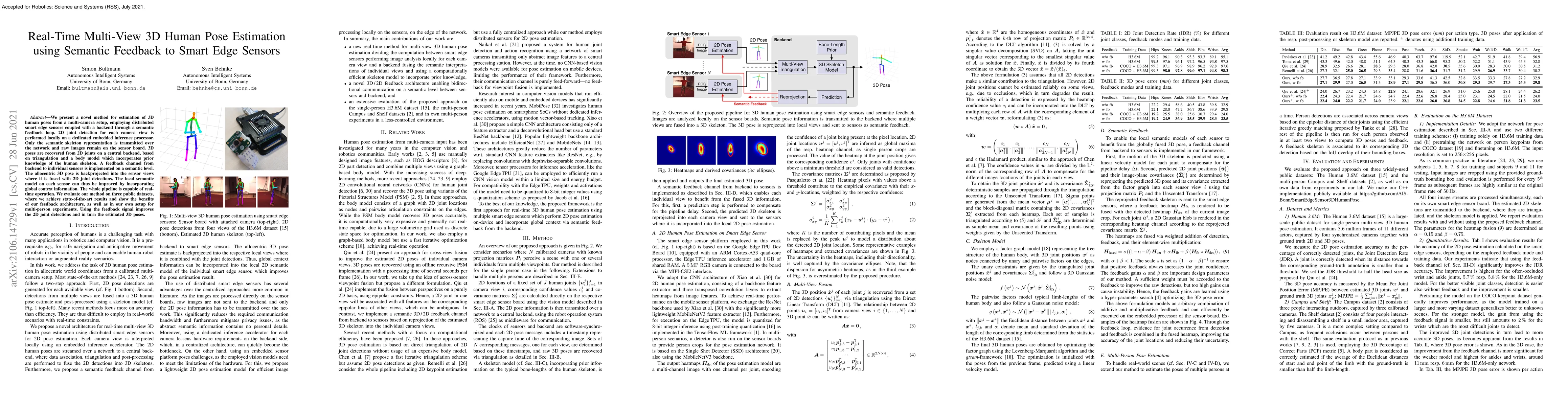 This paper proposes a real-time method for 3D human pose estimation using multi-view cameras and smart edge sensors, with a semantic feedback loop to enhance local detections. The method achieves state-of-the-art results by leveraging distributed processing and global context information.