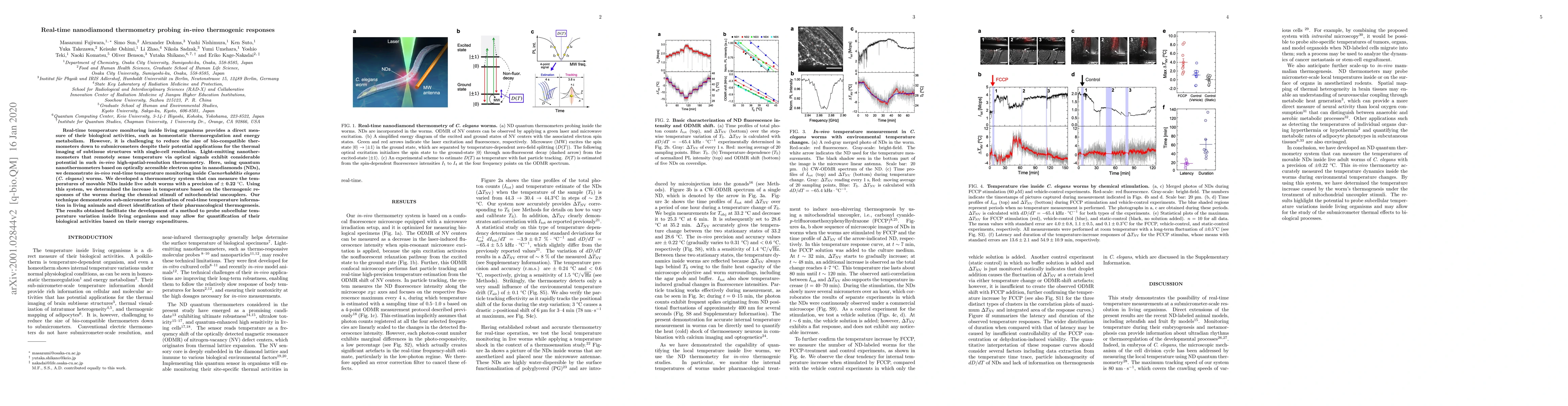 This paper presents a novel method for real-time in-vivo thermometry using quantum nanothermometers based on nanodiamonds, achieving precise temperature monitoring inside \textit{Caenorhabditis elegans} worms. The technique enables the identification of thermogenic responses to chemical stimuli, offering insights into biological activities and energy metabolism at subcellular levels.