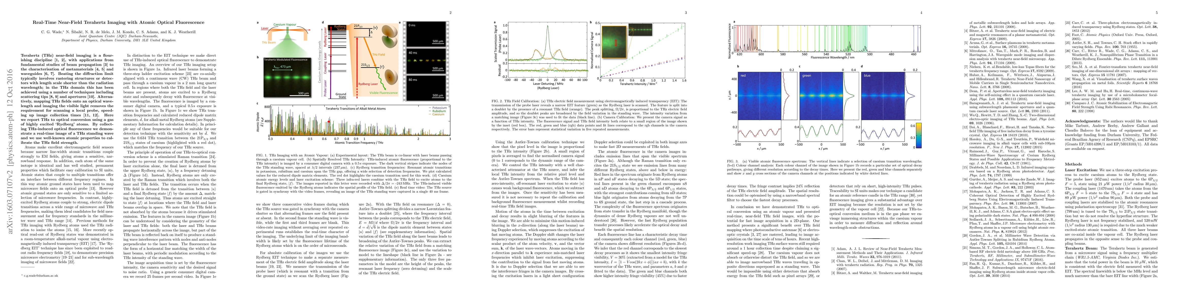 Terahertz (THz) near-field imaging is a flourishing discipline [1], with applications from fundamental studies of beam propagation [2,3] to the characterisation of metameterials [4,5] and waveguides [6,7]. Beating the diffraction limit typically involves rastering structures or detectors with length scale shorter than the radiation wavelength; in the THz domain this has been achieved using a number of techniques including scattering tips [8,9] and apertures [10]. Alternatively, mapping THz fields onto an optical wavelength and imaging the visible light removes the requirement for scanning a local probe, speeding up image collection times [11,12]. Here we report THz to optical conversion using a gas of highly excited `Rydberg' atoms. By collecting THz-induced optical fluorescence we demonstrate a real-time image of a THz standing wave and we use well-known atomic properties to calibrate the THz field strength. The mono-atomic gas does not distort the THz field and offers the potential to immerse structures within the THz-to-optical conversion medium.