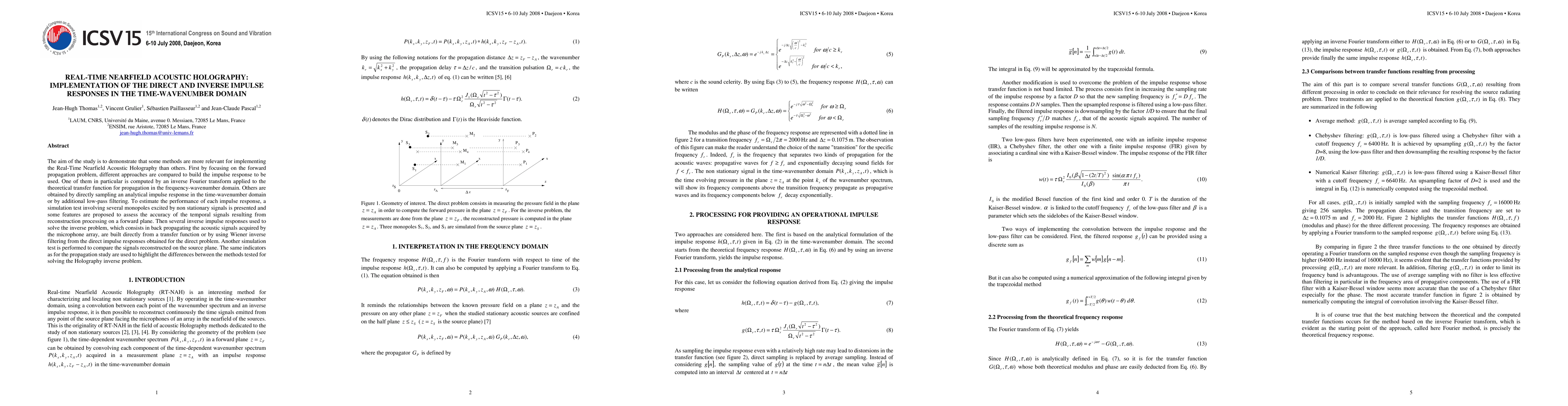 The aim of the study is to demonstrate that some methods are more relevant for implementing the Real-Time Nearfield Acoustic Holography than others. First by focusing on the forward propagation problem, different approaches are compared to build the impulse response to be used. One of them in particular is computed by an inverse Fourier transform applied to the theoretical transfer function for propagation in the frequency-wavenumber domain. Others are obtained by directly sampling an analytical impulse response in the time-wavenumber domain or by additional low-pass filtering. To estimate the performance of each impulse response, a simulation test involving several monopoles excited by non stationary signals is presented and some features are proposed to assess the accuracy of the temporal signals resulting from reconstruction processing on a forward plane. Then several inverse impulse responses used to solve the inverse problem, which consists in back propagating the acoustic signals acquired by the microphone array, are built directly from a transfer function or by using Wiener inverse filtering from the direct impulse responses obtained for the direct problem. Another simulation test is performed to compare the signals reconstructed on the source plane. The same indicators as for the propagation study are used to highlight the differences between the methods tested for solving the Holography inverse problem.