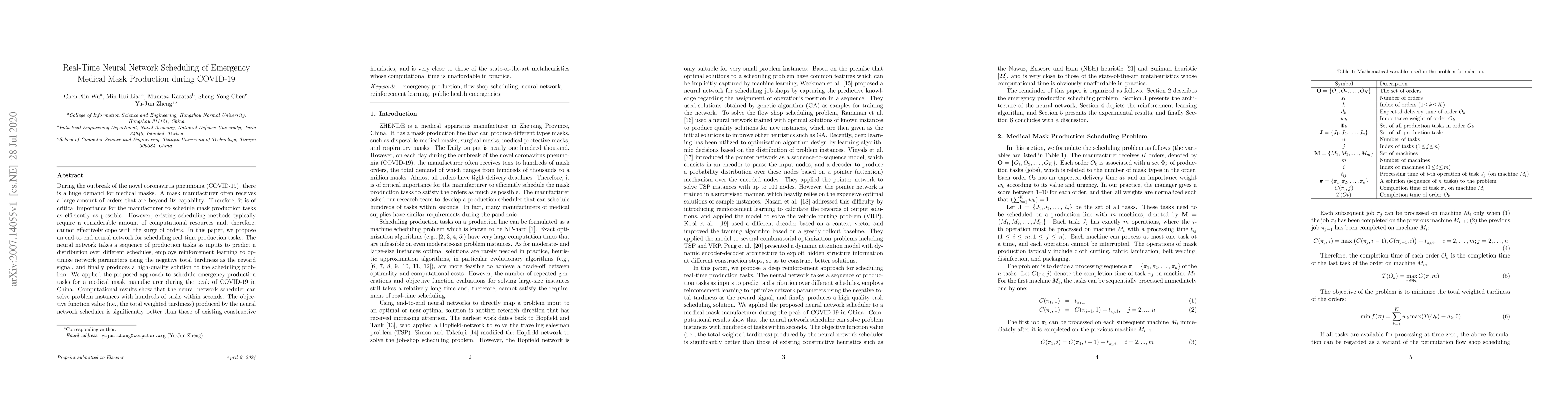 Researchers developed a neural network scheduler to efficiently manage emergency medical mask production during COVID-19, outperforming existing methods in terms of quality and speed.