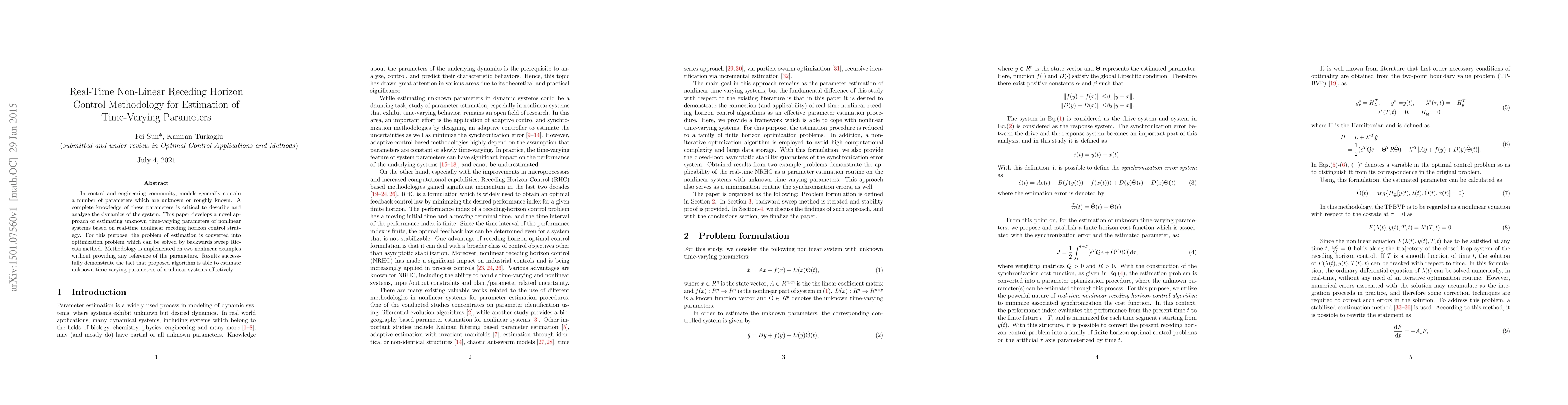 This paper introduces a real-time non-linear receding horizon control methodology for estimating unknown time-varying parameters in nonlinear systems. The estimation problem is framed as an optimization issue solved via the backwards sweep Riccati method, successfully demonstrated through two nonlinear examples.