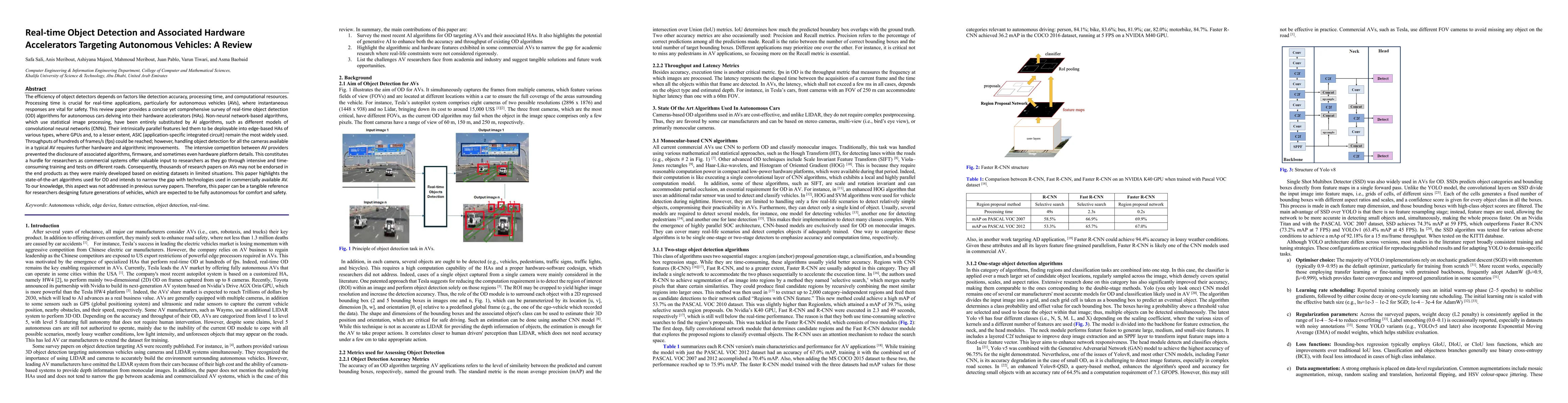 The efficiency of object detectors depends on factors like detection accuracy, processing time, and computational resources. Processing time is crucial for real-time applications, particularly for autonomous vehicles (AVs), where instantaneous responses are vital for safety. This review paper provides a concise yet comprehensive survey of real-time object detection (OD) algorithms for autonomous cars delving into their hardware accelerators (HAs). Non-neural network-based algorithms, which use statistical image processing, have been entirely substituted by AI algorithms, such as different models of convolutional neural networks (CNNs). Their intrinsically parallel features led them to be deployable into edge-based HAs of various types, where GPUs and, to a lesser extent, ASIC (application-specific integrated circuit) remain the most widely used. Throughputs of hundreds of frames/s (fps) could be reached; however, handling object detection for all the cameras available in a typical AV requires further hardware and algorithmic improvements. The intensive competition between AV providers has limited the disclosure of algorithms, firmware, and even hardware platform details. This remains a hurdle for researchers, as commercial systems provide valuable insights while academics undergo lengthy training and testing on restricted datasets and road scenarios. Consequently, many AV research papers may not be reflected in end products, being developed under limited conditions. This paper surveys state-of-the-art OD algorithms and aims to bridge the gap with technologies in commercial AVs. To our knowledge, this aspect has not been addressed in earlier surveys. Hence, the paper serves as a tangible reference for researchers designing future generations of vehicles, expected to be fully autonomous for comfort and safety.