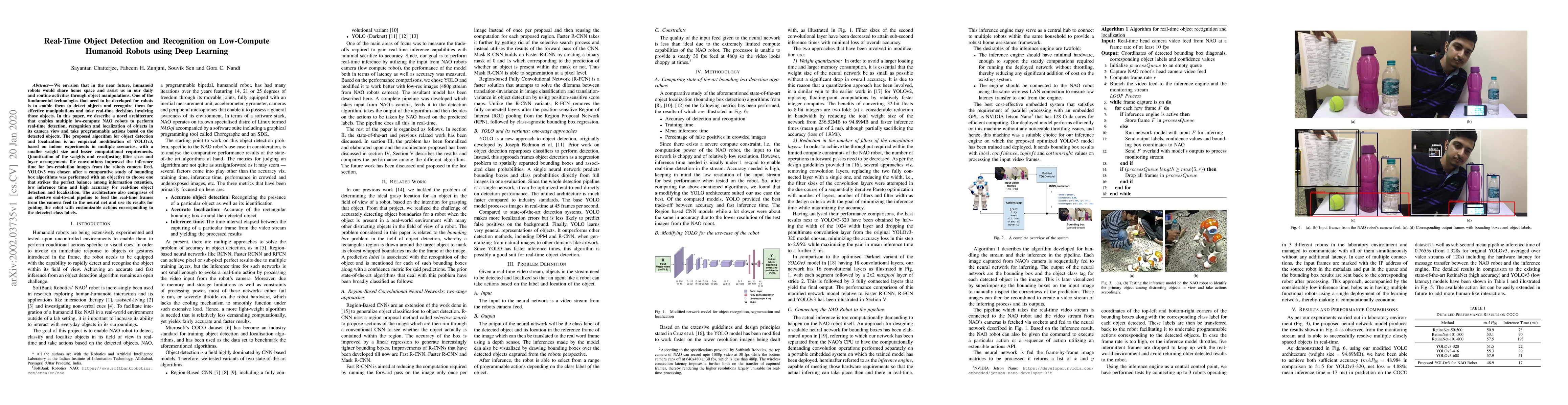 We envision that in the near future, humanoid robots would share home space and assist us in our daily and routine activities through object manipulations. One of the fundamental technologies that need to be developed for robots is to enable them to detect objects and recognize them for effective manipulations and take real-time decisions involving those objects. In this paper, we describe a novel architecture that enables multiple low-compute NAO robots to perform real-time detection, recognition and localization of objects in its camera view and take programmable actions based on the detected objects. The proposed algorithm for object detection and localization is an empirical modification of YOLOv3, based on indoor experiments in multiple scenarios, with a smaller weight size and lesser computational requirements. Quantization of the weights and re-adjusting filter sizes and layer arrangements for convolutions improved the inference time for low-resolution images from the robot s camera feed. YOLOv3 was chosen after a comparative study of bounding box algorithms was performed with an objective to choose one that strikes the perfect balance among information retention, low inference time and high accuracy for real-time object detection and localization. The architecture also comprises of an effective end-to-end pipeline to feed the real-time frames from the camera feed to the neural net and use its results for guiding the robot with customizable actions corresponding to the detected class labels.