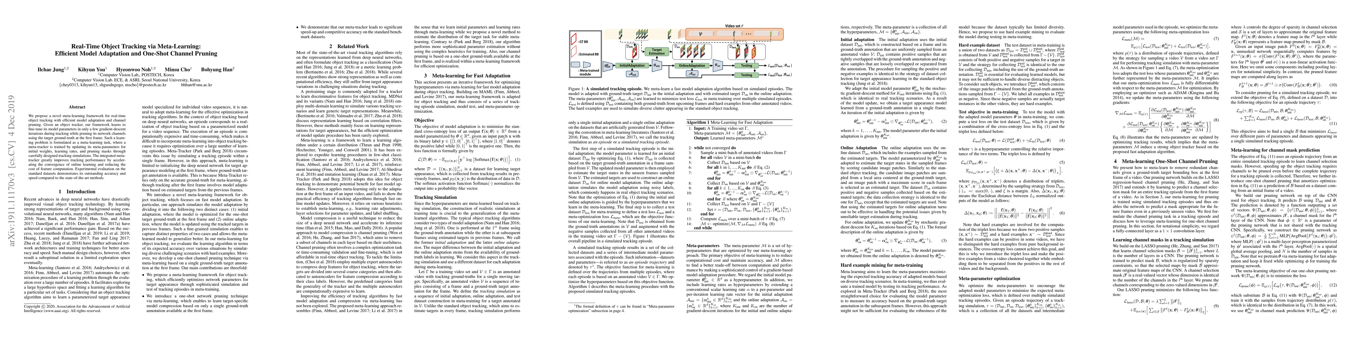 This paper introduces a meta-learning framework for real-time object tracking that enhances model adaptation and employs one-shot channel pruning. The proposed method efficiently fine-tunes model parameters and prunes network channels with minimal computational cost, achieving superior accuracy and speed compared to existing methods.