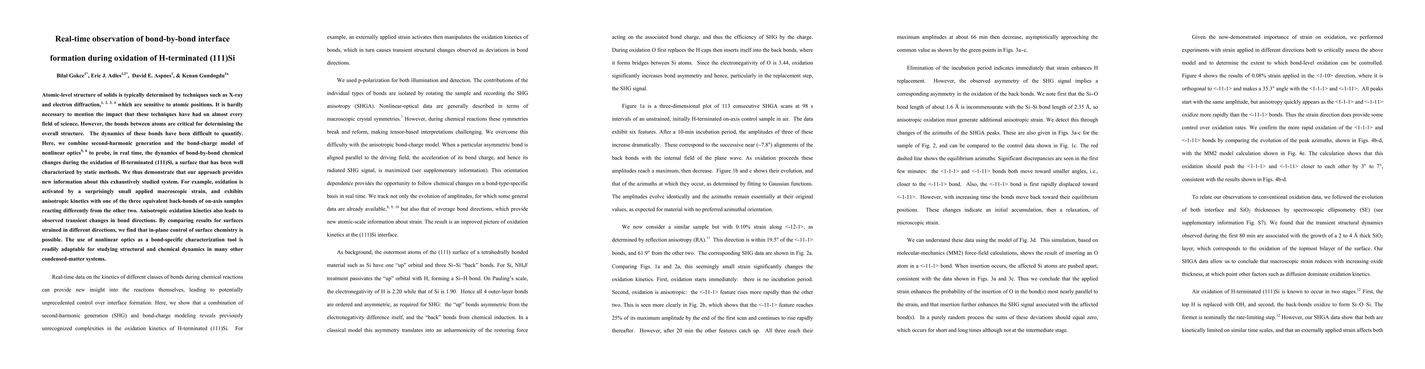 Atomic-level structure of solids is typically determined by techniques such as X-ray and electron diffraction,1, 2, 3, 4 which are sensitive to atomic positions. It is hardly necessary to mention the impact that these techniques have had on almost every field of science. However, the bonds between atoms are critical for determining the overall structure. The dynamics of these bonds have been difficult to quantify. Here, we combine second-harmonic generation and the bond-charge model of nonlinear optics5, 6 to probe, in real time, the dynamics of bond-by-bond chemical changes during the oxidation of H-terminated (111)Si, a surface that has been well characterized by static methods. We thus demonstrate that our approach provides new information about this exhaustively studied system. For example, oxidation is activated by a surprisingly small applied macroscopic strain, and exhibits anisotropic kinetics with one of the three equivalent back-bonds of on-axis samples reacting differently from the other two. Anisotropic oxidation kinetics also leads to observed transient changes in bond directions. By comparing results for surfaces strained in different directions, we find that in-plane control of surface chemistry is possible. The use of nonlinear optics as a bond-specific characterization tool is readily adaptable for studying structural and chemical dynamics in many other condensed-matter systems.