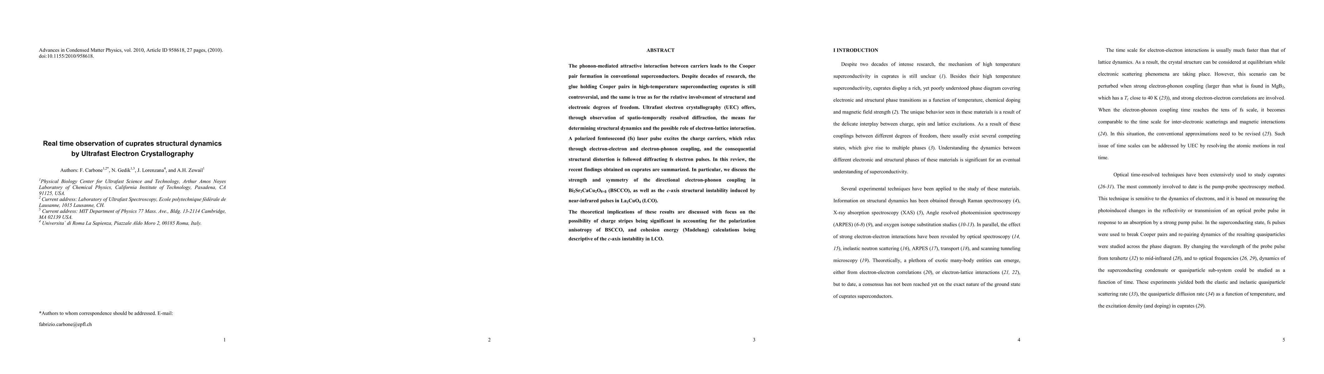 The phonon-mediated attractive interaction between carriers leads to the Cooper pair formation in conventional superconductors. Despite decades of research, the glue holding Cooper pairs in high-temperature superconducting cuprates is still controversial, and the same is true as for the relative involvement of structural and electronic degrees of freedom. Ultrafast electron crystallography (UEC) offers, through observation of spatio-temporally resolved diffraction, the means for determining structural dynamics and the possible role of electron-lattice interaction. A polarized femtosecond (fs) laser pulse excites the charge carriers, which relax through electron-electron and electron-phonon coupling, and the consequential structural distortion is followed diffracting fs electron pulses. In this review, the recent findings obtained on cuprates are summarized. In particular, we discuss the strength and symmetry of the directional electron-phonon coupling in Bi2Sr2CaCu2O8+\delta (BSCCO), as well as the c-axis structural instability induced by near-infrared pulses in La2CuO4 (LCO). The theoretical implications of these results are discussed with focus on the possibility of charge stripes being significant in accounting for the polarization anisotropy of BSCCO, and cohesion energy (Madelung) calculations being descriptive of the c-axis instability in LCO.