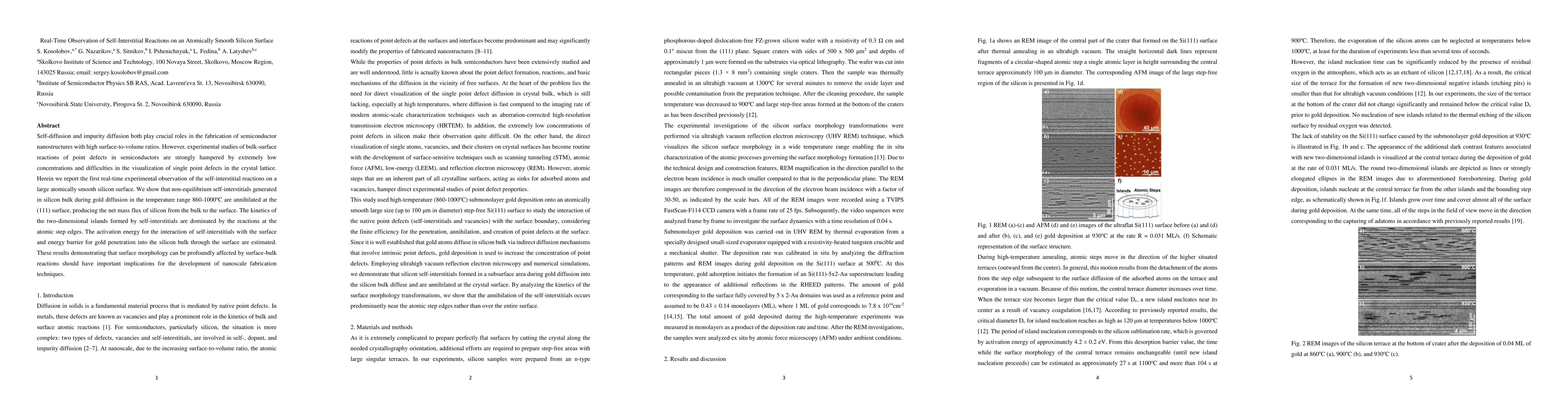This study reports the first real-time observation of self-interstitial reactions on an atomically smooth silicon surface, revealing that self-interstitials generated during gold diffusion are annihilated at the surface, leading to silicon mass flux from the bulk to the surface. The findings highlight the significant impact of surface-bulk reactions on surface morphology, with implications for nanoscale fabrication techniques.