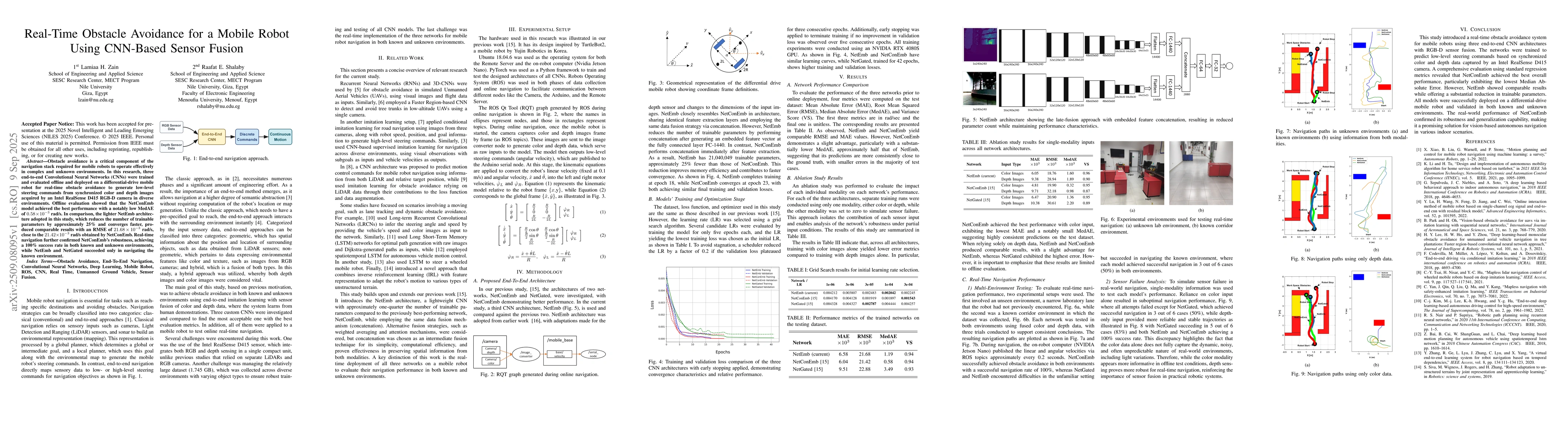 Obstacle avoidance is a critical component of the navigation stack required for mobile robots to operate effectively in complex and unknown environments. In this research, three end-to-end Convolutional Neural Networks (CNNs) were trained and evaluated offline and deployed on a differential-drive mobile robot for real-time obstacle avoidance to generate low-level steering commands from synchronized color and depth images acquired by an Intel RealSense D415 RGB-D camera in diverse environments. Offline evaluation showed that the NetConEmb model achieved the best performance with a notably low MedAE of $0.58 \times 10^{-3}$ rad/s. In comparison, the lighter NetEmb architecture adopted in this study, which reduces the number of trainable parameters by approximately 25\% and converges faster, produced comparable results with an RMSE of $21.68 \times 10^{-3}$ rad/s, close to the $21.42 \times 10^{-3}$ rad/s obtained by NetConEmb. Real-time navigation further confirmed NetConEmb's robustness, achieving a 100\% success rate in both known and unknown environments, while NetEmb and NetGated succeeded only in navigating the known environment.