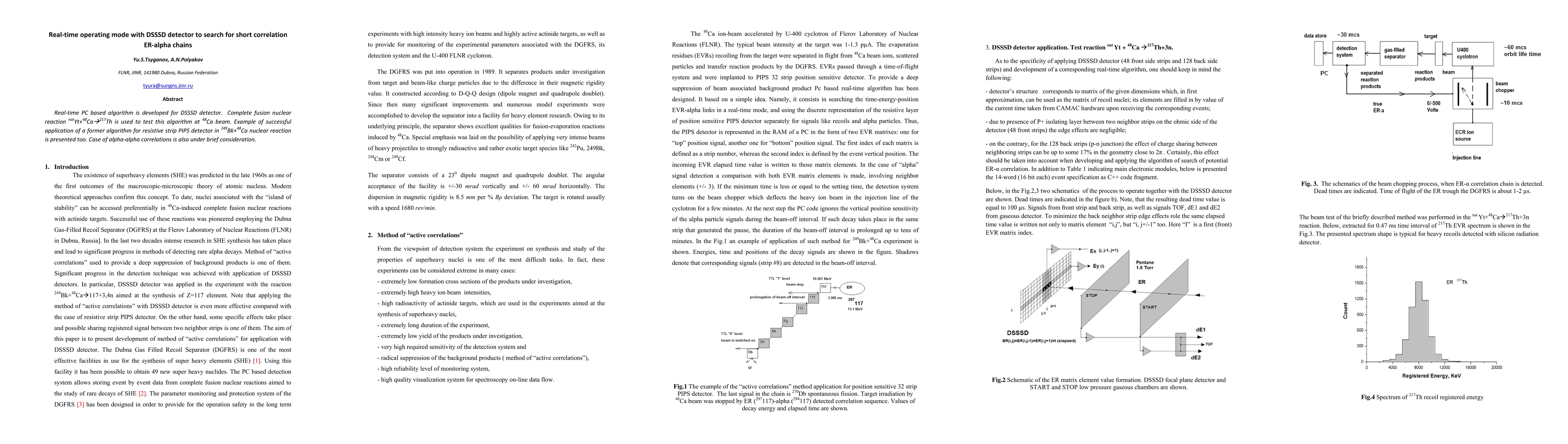 Real-time PC based algorithm is developed for DSSSD detector. Complete fusion nuclear reaction natYb+48Ca->217Th is used to test this algorithm at 48Ca beam. Example of successful application of a former algorithm for resistive strip PIPS detector in 249Bk+48Ca nuclear reaction is presented too. Case of alpha-alpha correlations is also under brief consideration.
