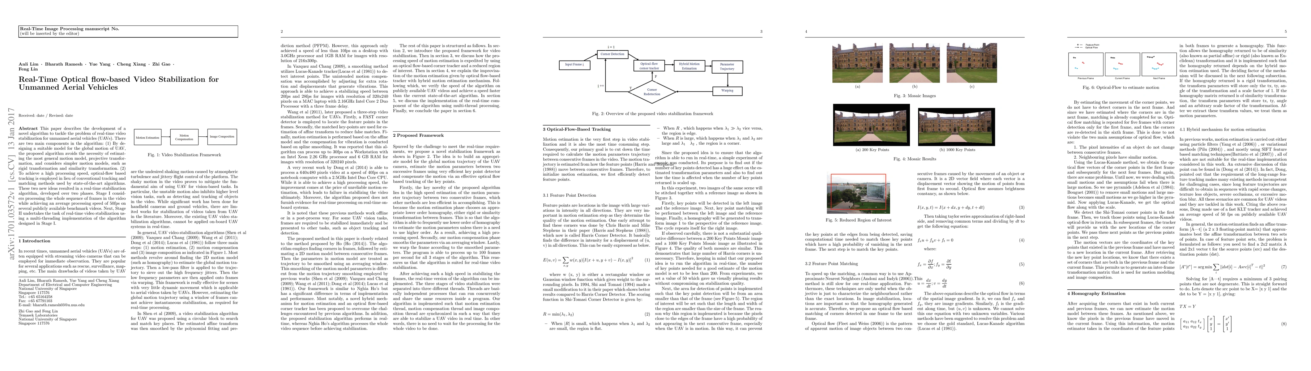This paper describes the development of a novel algorithm to tackle the problem of real-time video stabilization for unmanned aerial vehicles (UAVs). There are two main components in the algorithm: (1) By designing a suitable model for the global motion of UAV, the proposed algorithm avoids the necessity of estimating the most general motion model, projective transformation, and considers simpler motion models, such as rigid transformation and similarity transformation. (2) To achieve a high processing speed, optical-flow based tracking is employed in lieu of conventional tracking and matching methods used by state-of-the-art algorithms. These two new ideas resulted in a real-time stabilization algorithm, developed over two phases. Stage I considers processing the whole sequence of frames in the video while achieving an average processing speed of 50fps on several publicly available benchmark videos. Next, Stage II undertakes the task of real-time video stabilization using a multi-threading implementation of the algorithm designed in Stage I.