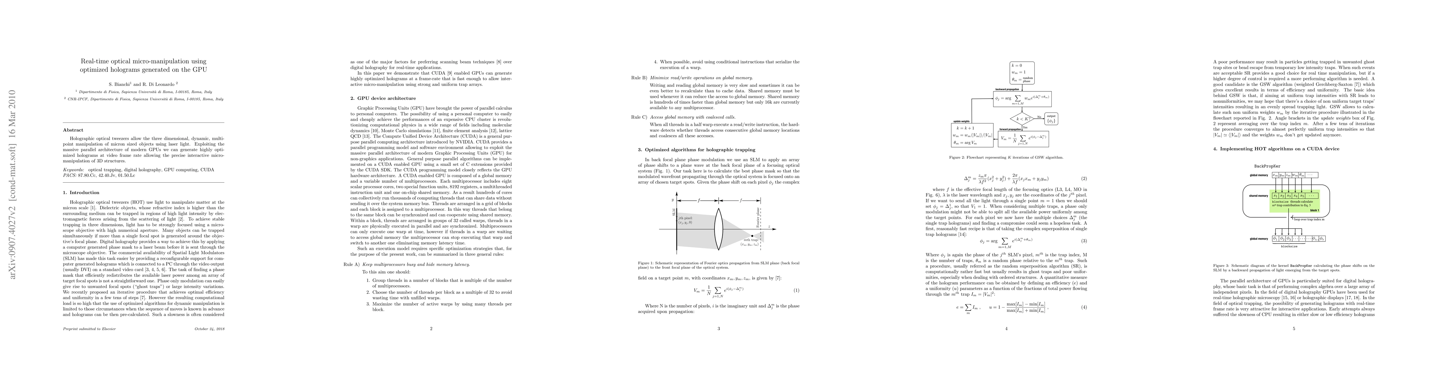 This paper presents a method using GPU-generated optimized holograms for real-time holographic optical tweezers, enabling three-dimensional, dynamic, and multipoint manipulation of micron-sized dielectric objects at video frame rates. The use of GPUs enhances the efficiency and speed of hologram generation for interactive micro-manipulation.
