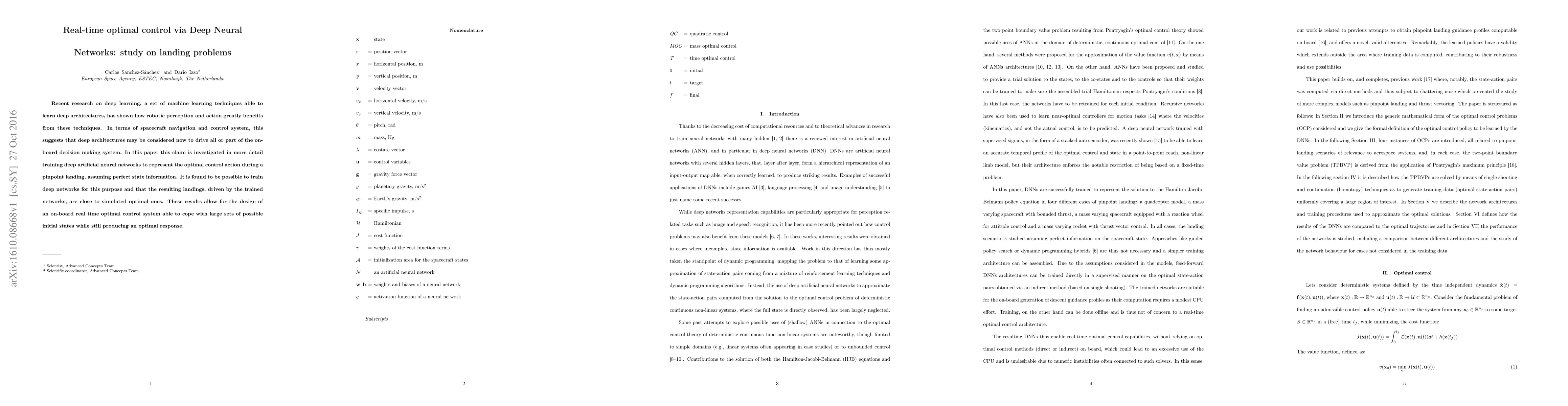 This paper investigates the use of deep neural networks for real-time optimal control during spacecraft landing, demonstrating that trained networks can achieve landings close to simulated optimal ones. The findings suggest the potential for an on-board system to handle diverse initial states and produce optimal responses.