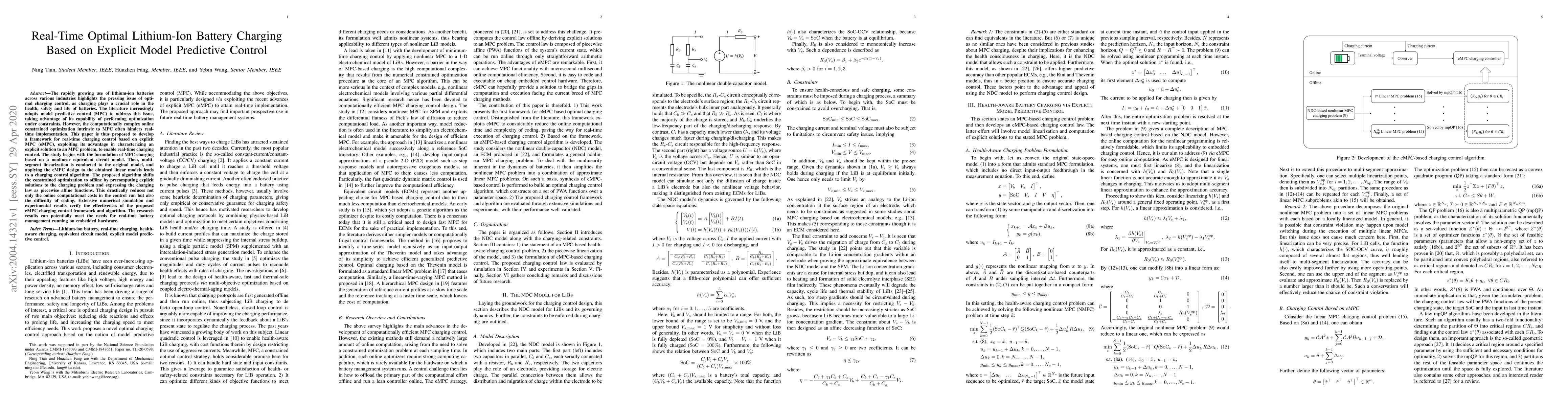 This paper proposes a real-time optimal lithium-ion battery charging control framework using explicit model predictive control (eMPC) to address computational complexity issues. The eMPC method precomputes explicit solutions offline, transforming the charging problem into piecewise affine functions, thus reducing online computational costs and simplifying implementation.