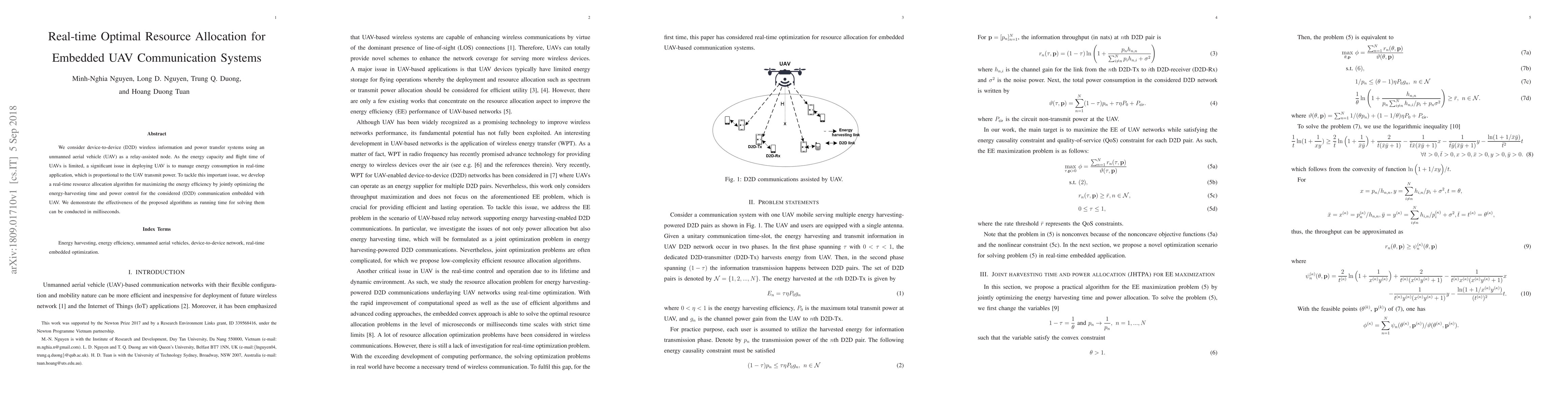 We consider device-to-device (D2D) wireless information and power transfer systems using an unmanned aerial vehicle (UAV) as a relay-assisted node. As the energy capacity and flight time of UAVs is limited, a significant issue in deploying UAV is to manage energy consumption in real-time application, which is proportional to the UAV transmit power. To tackle this important issue, we develop a real-time resource allocation algorithm for maximizing the energy efficiency by jointly optimizing the energy-harvesting time and power control for the considered (D2D) communication embedded with UAV. We demonstrate the effectiveness of the proposed algorithms as running time for solving them can be conducted in milliseconds.