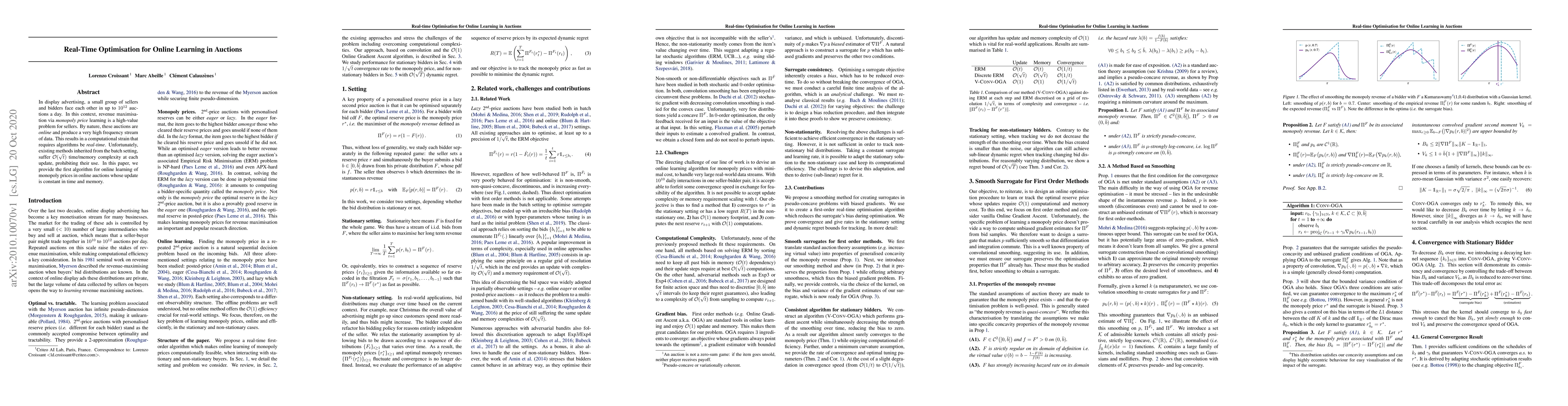 In display advertising, a small group of sellers and bidders face each other in up to 10 12 auctions a day. In this context, revenue maximisation via monopoly price learning is a high-value problem for sellers. By nature, these auctions are online and produce a very high frequency stream of data. This results in a computational strain that requires algorithms be real-time. Unfortunately, existing methods inherited from the batch setting suffer O($\sqrt t$) time/memory complexity at each update, prohibiting their use. In this paper, we provide the first algorithm for online learning of monopoly prices in online auctions whose update is constant in time and memory.