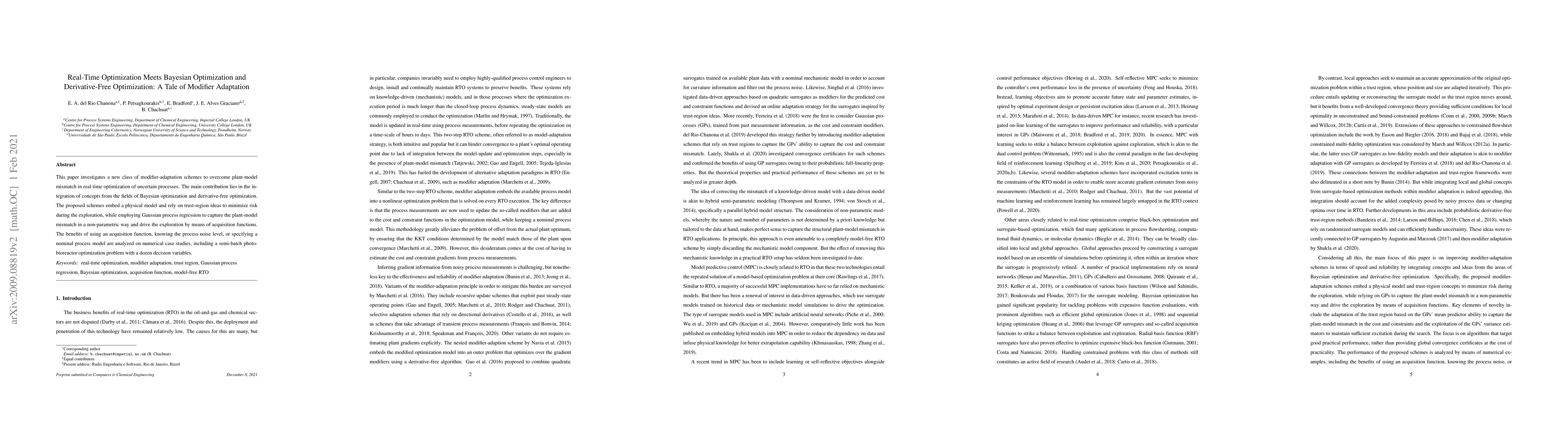 This paper develops new methods for real-time optimization that combine Bayesian optimization and derivative-free optimization to minimize risk and capture plant-model mismatch in uncertain processes. It demonstrates the benefits of using acquisition functions and specifying a nominal process model on numerical case studies.