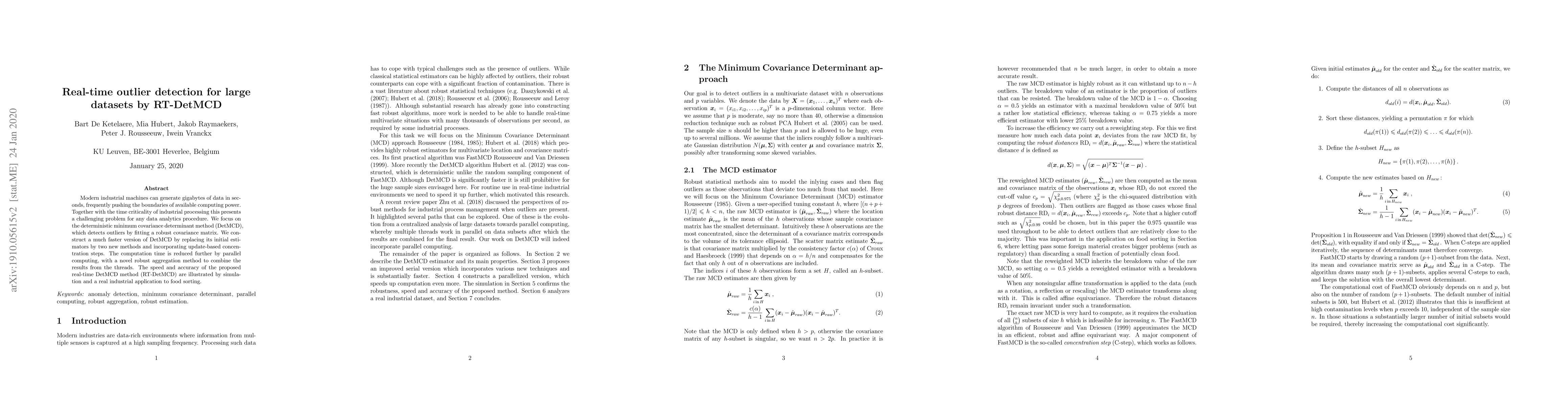 The paper proposes RT-DetMCD, a real-time outlier detection method for large datasets, enhancing the deterministic minimum covariance determinant method with faster initial estimators and parallel computing for improved speed and accuracy, demonstrated through simulations and an industrial food sorting application.