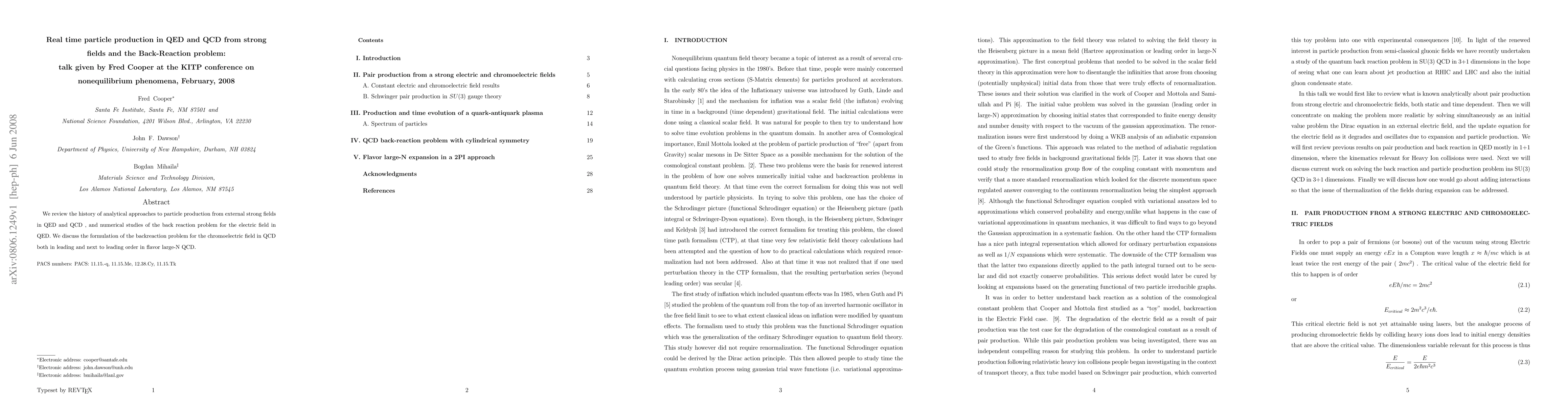 We review the history of analytical approaches to particle production from external strong fields in QED and QCD, and numerical studies of the back reaction problem for the electric field in QED. We discuss the formulation of the backreaction problem for the chromoelectric field in QCD both in leading and next to leading order in flavor large-N QCD.