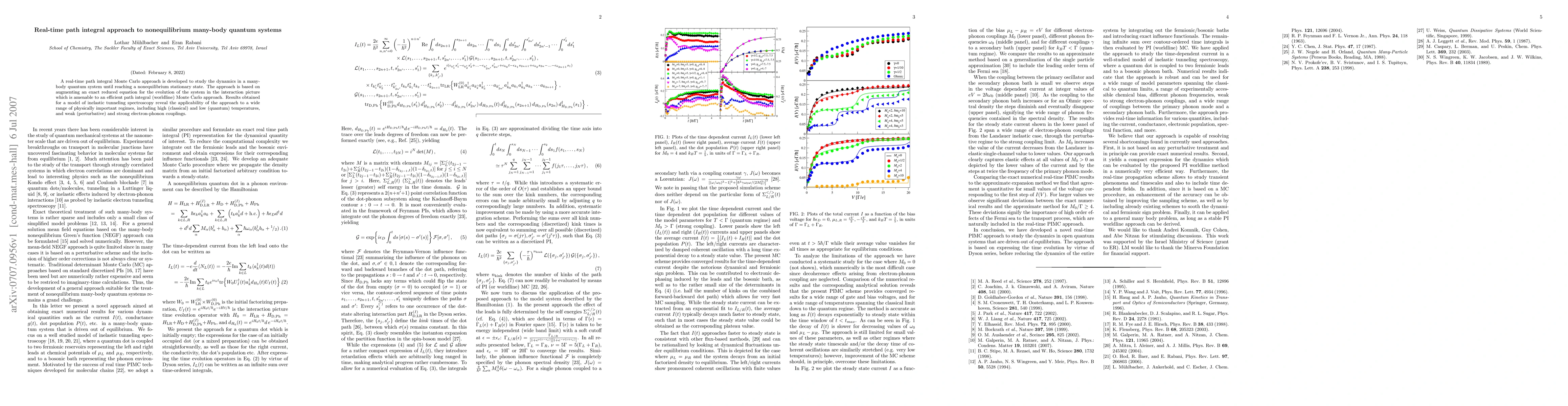 This paper develops a real-time path integral Monte Carlo approach to study the dynamics of nonequilibrium many-body quantum systems, demonstrating its applicability across various temperature regimes and electron-phonon coupling strengths through a model of inelastic tunneling spectroscopy.