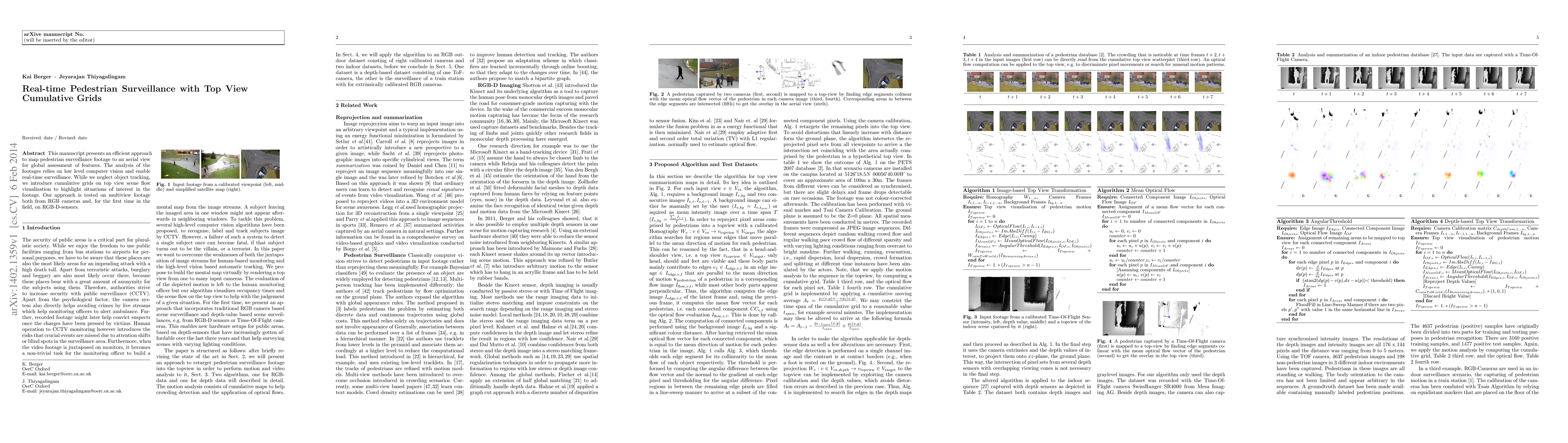 This paper proposes a method for real-time pedestrian surveillance using cumulative grids on top view scene flow visualization, enabling global assessment of surveillance footage. The approach, tested on both RGB and RGB-D sensors, focuses on global feature analysis without object tracking.