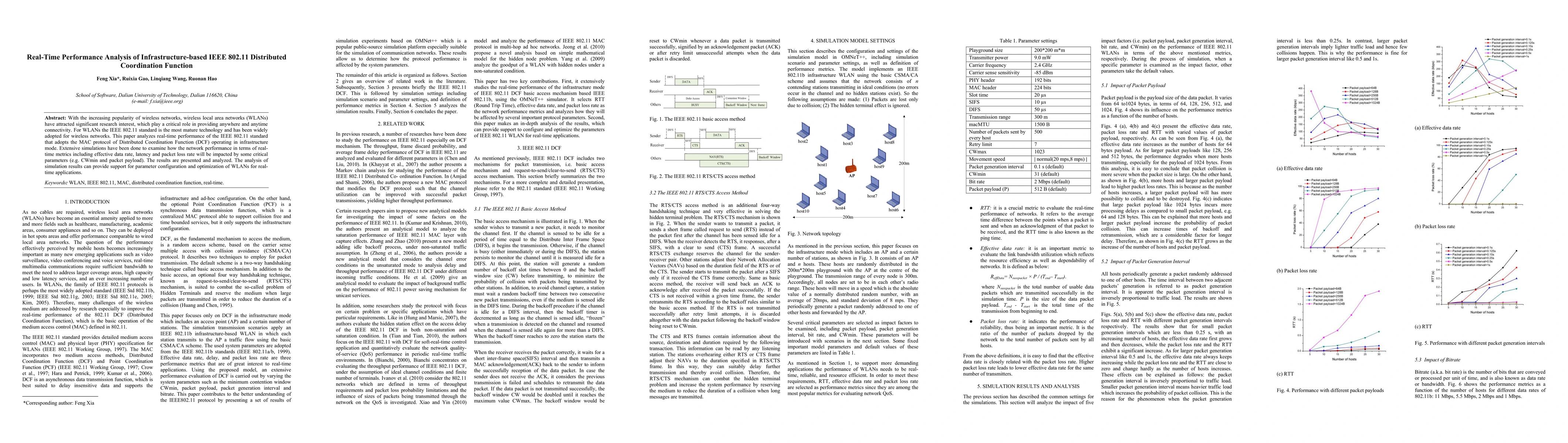 This paper conducts an extensive simulation study to analyze the real-time performance of IEEE 802.11 WLANs using the Distributed Coordination Function (DCF) in infrastructure mode, focusing on metrics like effective data rate, latency, and packet loss rate. The findings provide insights into optimizing WLAN parameters for real-time applications.