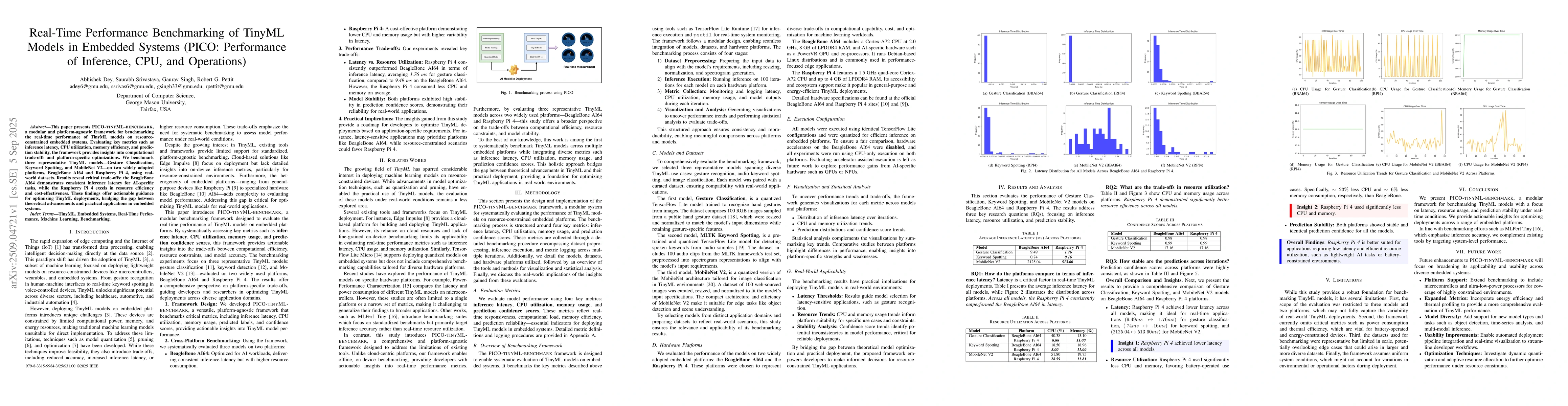 This paper presents PICO-TINYML-BENCHMARK, a modular and platform-agnostic framework for benchmarking the real-time performance of TinyML models on resource-constrained embedded systems. Evaluating key metrics such as inference latency, CPU utilization, memory efficiency, and prediction stability, the framework provides insights into computational trade-offs and platform-specific optimizations. We benchmark three representative TinyML models -- Gesture Classification, Keyword Spotting, and MobileNet V2 -- on two widely adopted platforms, BeagleBone AI64 and Raspberry Pi 4, using real-world datasets. Results reveal critical trade-offs: the BeagleBone AI64 demonstrates consistent inference latency for AI-specific tasks, while the Raspberry Pi 4 excels in resource efficiency and cost-effectiveness. These findings offer actionable guidance for optimizing TinyML deployments, bridging the gap between theoretical advancements and practical applications in embedded systems.