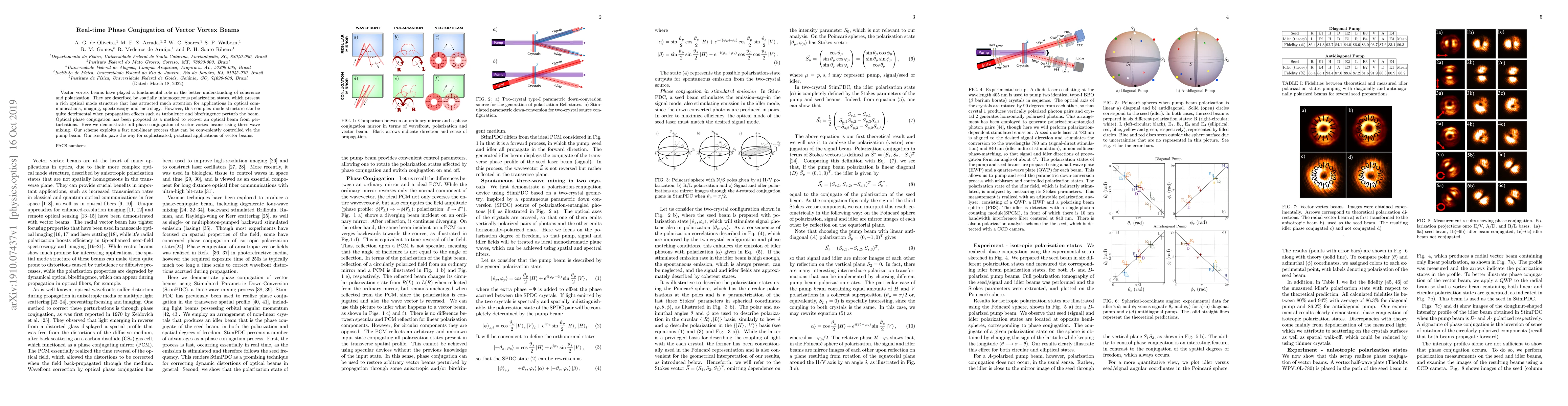 The paper presents a novel scheme for real-time phase conjugation of vector vortex beams using stimulated parametric down-conversion (StimPDC) in a two-crystal configuration, which is controllable via the pump beam.