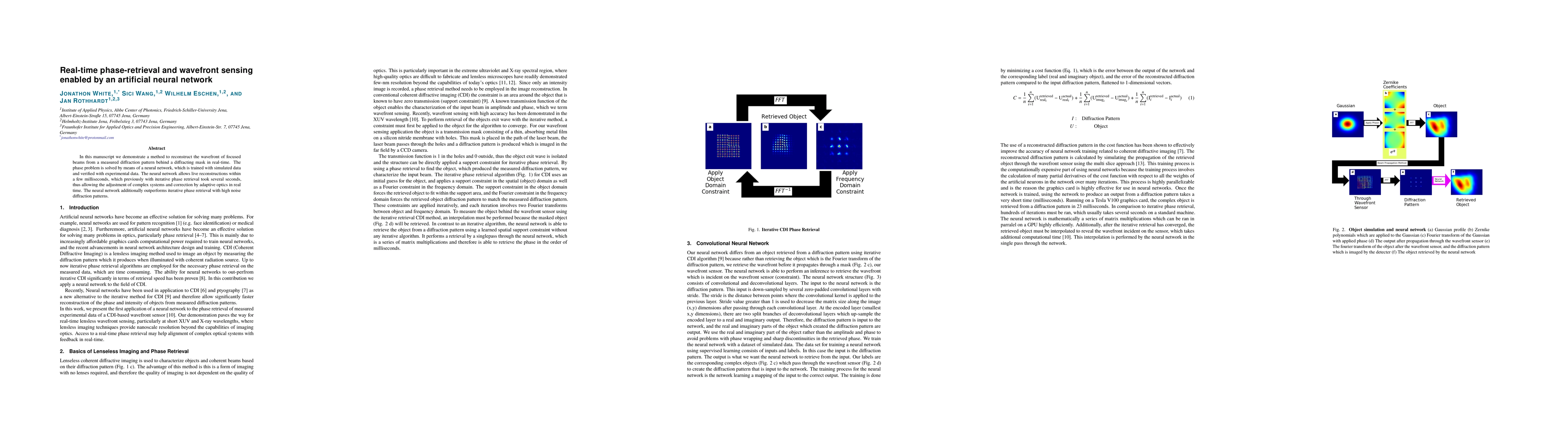In this manuscript we demonstrate a method to reconstruct the wavefront of focused beams from a measured diffraction pattern behind a diffracting mask in real-time. The phase problem is solved by means of a neural network, which is trained with simulated data and verified with experimental data. The neural network allows live reconstructions within a few milliseconds, which previously with iterative phase retrieval took several seconds, thus allowing the adjustment of complex systems and correction by adaptive optics in real time. The neural network additionally outperforms iterative phase retrieval with high noise diffraction patterns.