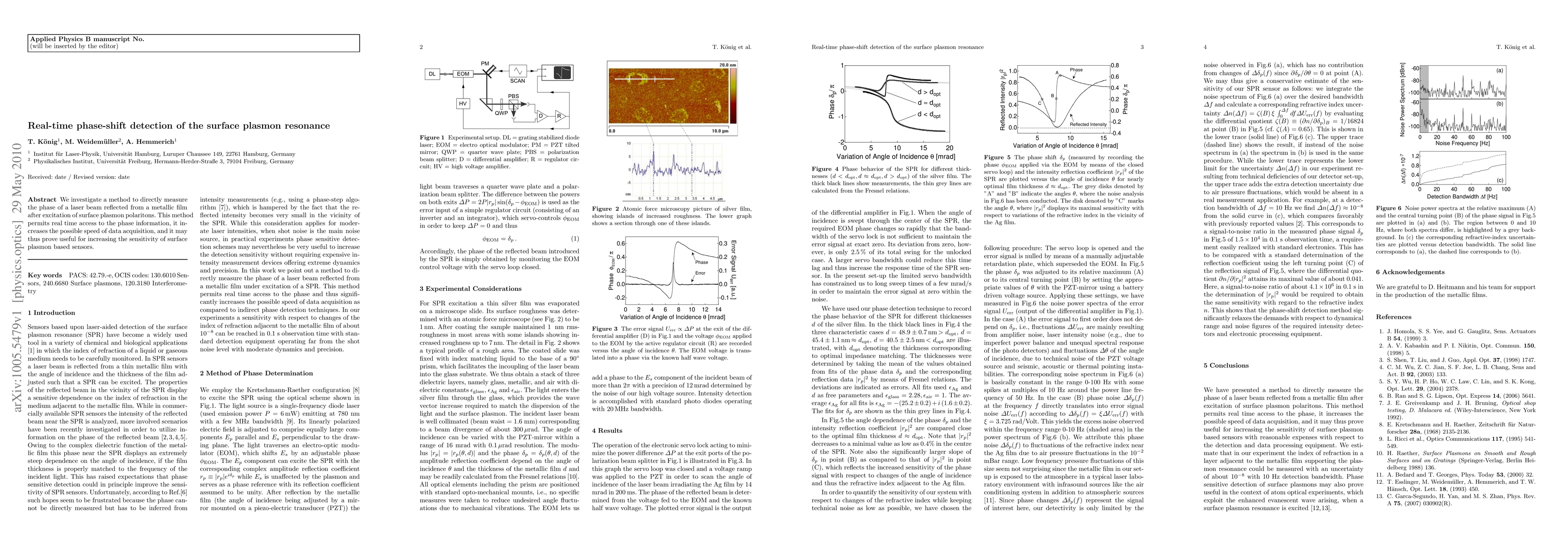 This paper proposes a real-time phase-shift detection method for surface plasmon resonance, enabling direct measurement of the phase of reflected laser beams from metallic films, which can enhance the speed of data acquisition and improve the sensitivity of surface plasmon-based sensors.