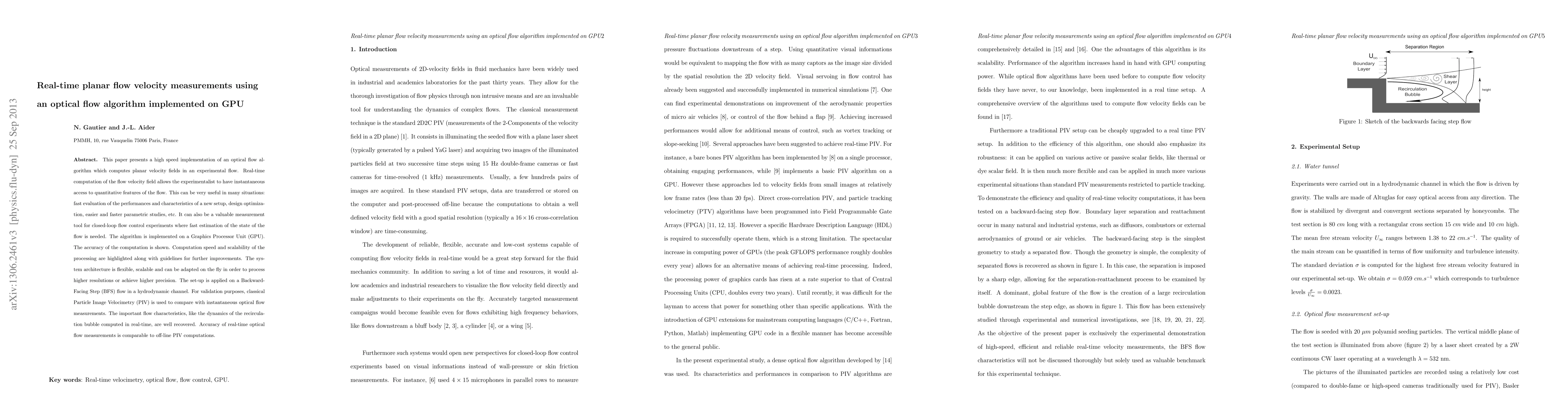 This paper introduces a GPU-based optical flow algorithm for real-time planar flow velocity measurements, demonstrating its speed, scalability, and accuracy comparable to Particle Image Velocimetry (PIV) in a Backward-Facing Step flow experiment. The system is flexible and can adapt to higher resolutions or precision.