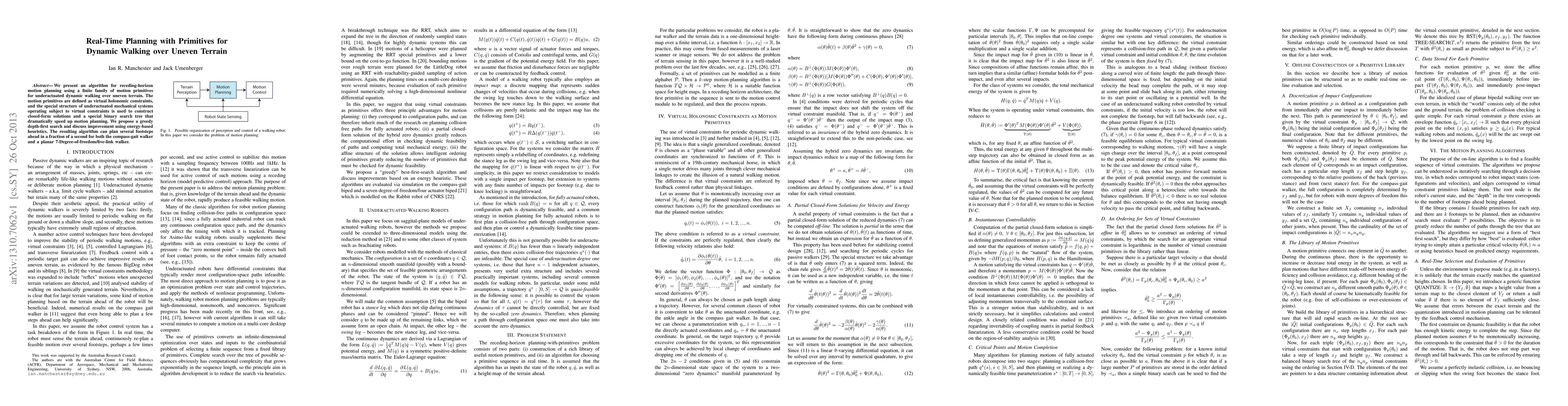 This paper introduces an algorithm for real-time motion planning using predefined motion primitives for dynamic walking over uneven terrain, leveraging virtual holonomic constraints and a binary search tree for speed. The approach employs a greedy depth-first search enhanced by energy-based heuristics, enabling rapid planning for multiple steps ahead.