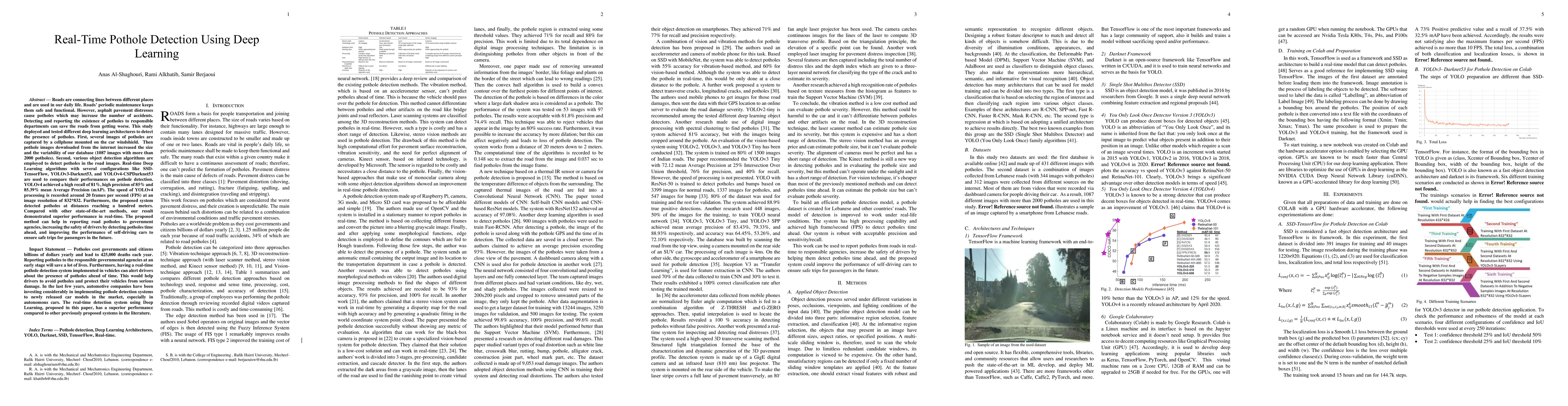 Roads are connecting line between different places, and used daily. Roads' periodic maintenance keeps them safe and functional. Detecting and reporting the existence of potholes to responsible departments can help in eliminating them. This study deployed and tested on different deep learning architecture to detect potholes. The images used for training were collected by cellphone mounted on the windshield of the car, in addition to many images downloaded from the internet to increase the size and variability of the database. Second, various object detection algorithms are employed and compared to detect potholes in real-time like SDD-TensorFlow, YOLOv3Darknet53 and YOLOv4Darknet53. YOLOv4 achieved the best performance with 81% recall, 85% precision and 85.39% mean Average Precision (mAP). The speed of processing was 20 frame per second. The system was able to detect potholes from a range on 100 meters away from the camera. The system can increase the safety of drivers and improve the performance of self-driving cars by detecting pothole time ahead.