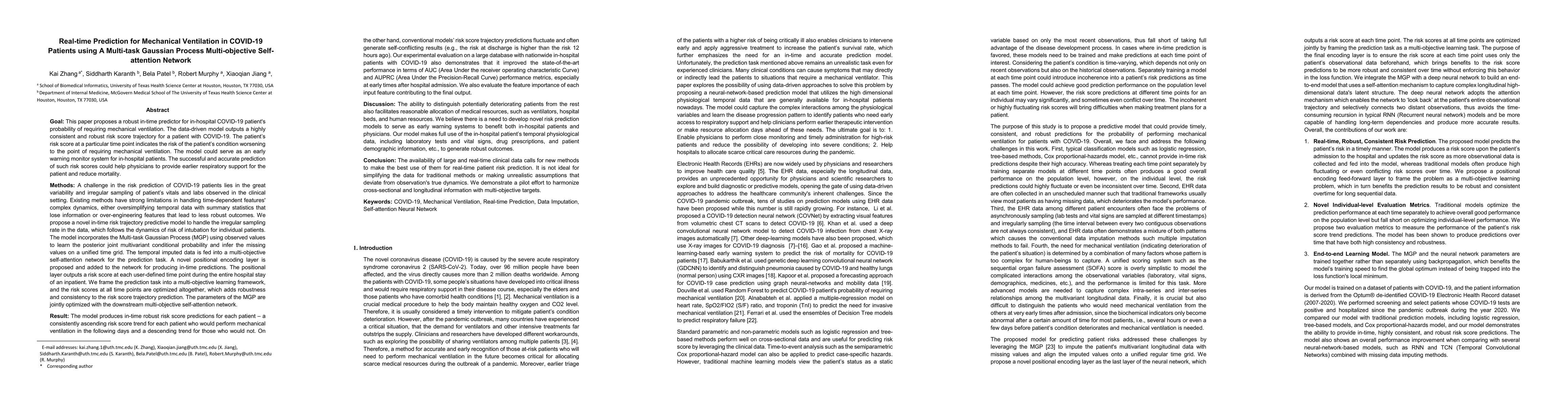 This paper proposes a novel predictive model using a Multi-task Gaussian Process Multi-objective Self-attention Network to accurately predict the risk of COVID-19 patients requiring mechanical ventilation in real-time. The model effectively handles irregularly sampled patient data and improves state-of-the-art performance in early risk prediction.