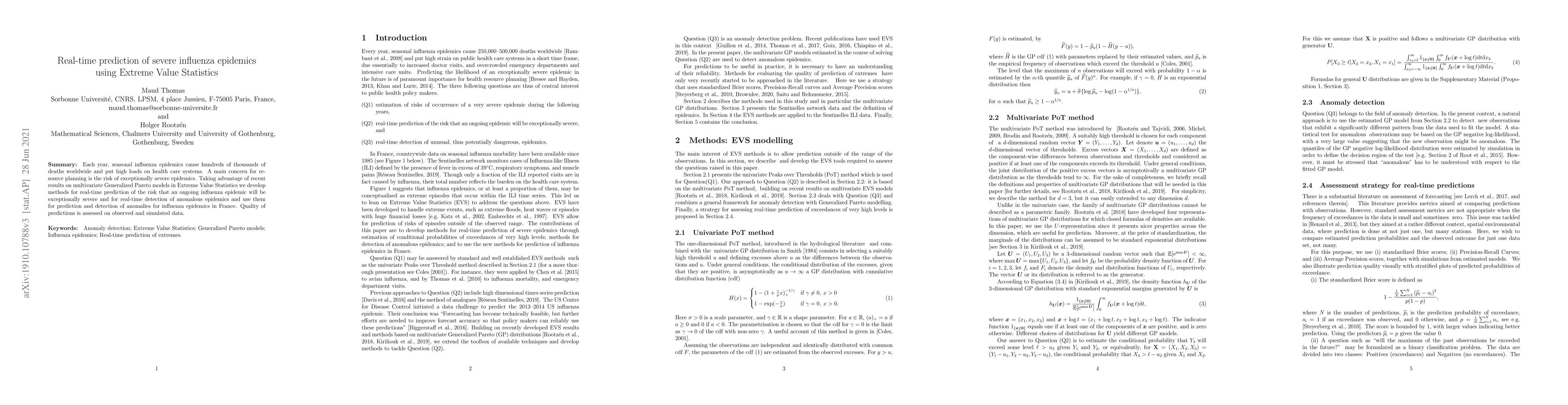 This paper develops real-time prediction methods for exceptionally severe influenza epidemics using multivariate Generalized Pareto models from Extreme Value Statistics. The methods are applied to detect and predict anomalies in influenza epidemics in France, with prediction accuracy assessed on both observed and simulated data.