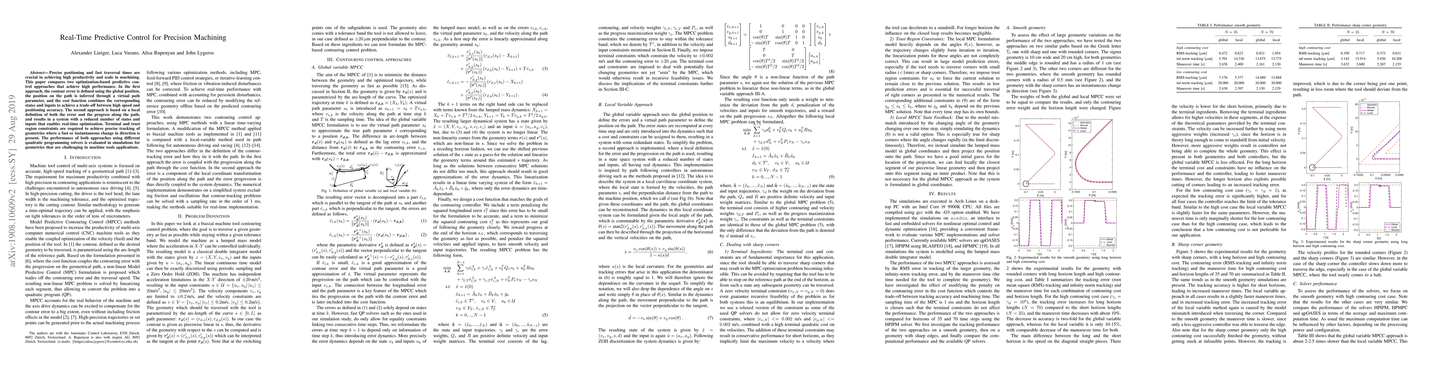 Precise positioning and fast traversal times are crucial in achieving high productivity and scale in machining. This paper compares two optimization-based predictive control approaches that achieve high performance. In the first approach, the contour error is defined using the global position, the position on the path is inferred through a virtual path parameter, and the cost function combines the corresponding states and inputs to achieve a trade-off between high speed and positioning accuracy. The second approach is based on a local definition of both the error and the progress along the path, and results in a system with a reduced number of states and inputs that enables real-time optimization. Terminal and trust region constraints are required to achieve precise tracking of geometries where a fast or instantaneous change in direction is present. The performance of both approaches using different quadratic programming solvers is evaluated in simulations for geometries that are challenging in machine tools applications.
