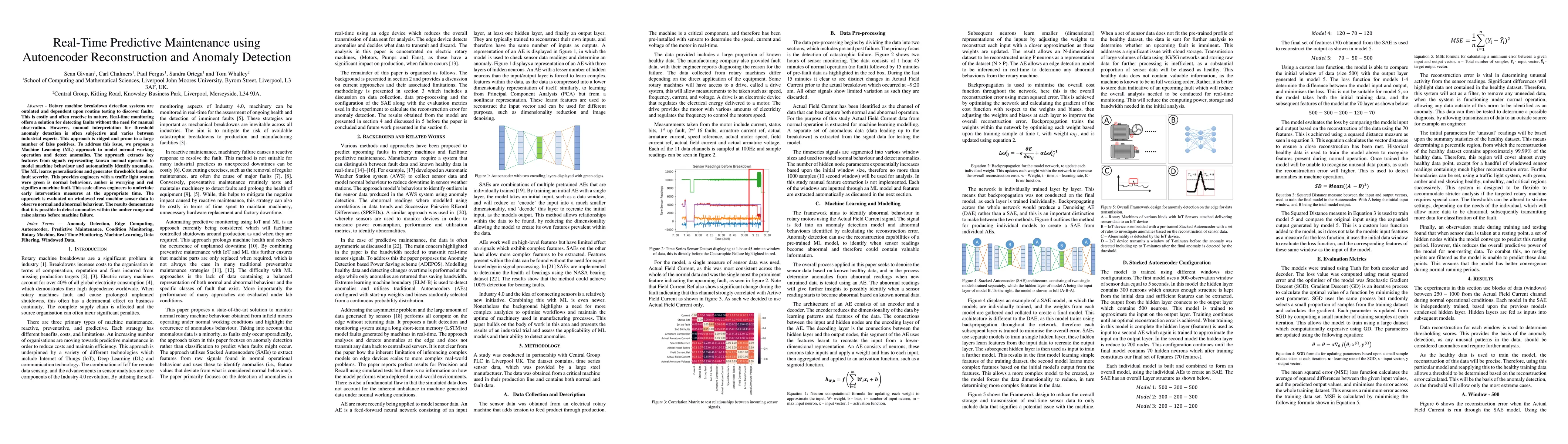 This paper proposes a Machine Learning approach for real-time predictive maintenance of rotary machines, addressing the limitations of traditional, routine-based breakdown detection systems. The method models normal machine behavior using autoencoder reconstruction and anomaly detection, automatically identifying anomalies and generating fault severity-based thresholds. Evaluated on real sensor data, the approach successfully detects anomalies and predicts machine failures, providing engineers with a 'traffic light' system for timely intervention.