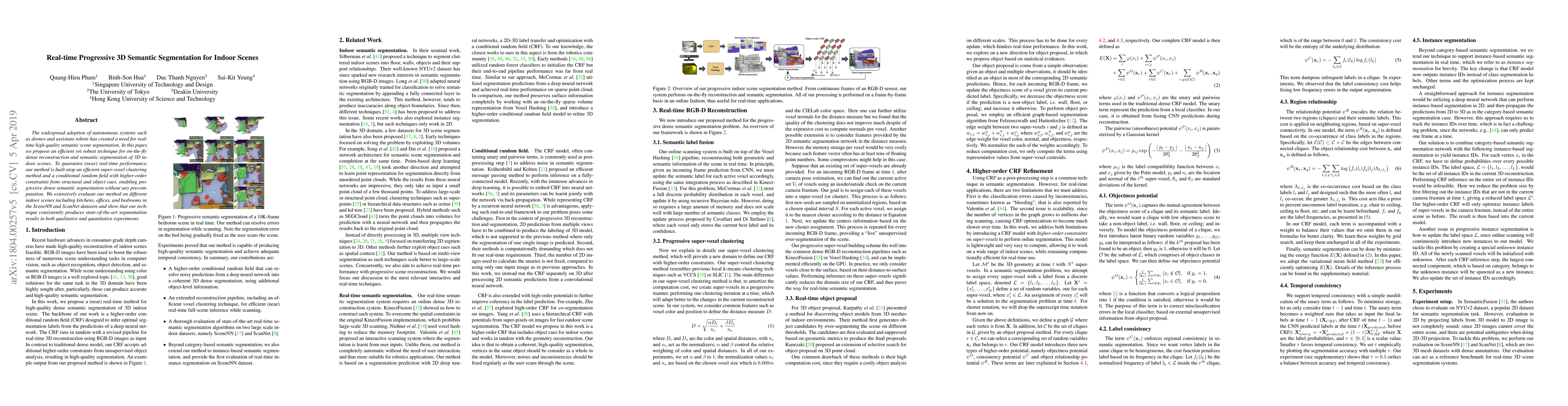 This paper proposes an efficient technique for real-time, progressive 3D semantic segmentation of indoor scenes using super-voxel clustering and a conditional random field with higher-order constraints. The method achieves high-quality segmentation results without precomputation, outperforming other methods in both qualitative and quantitative evaluations on various indoor environments.