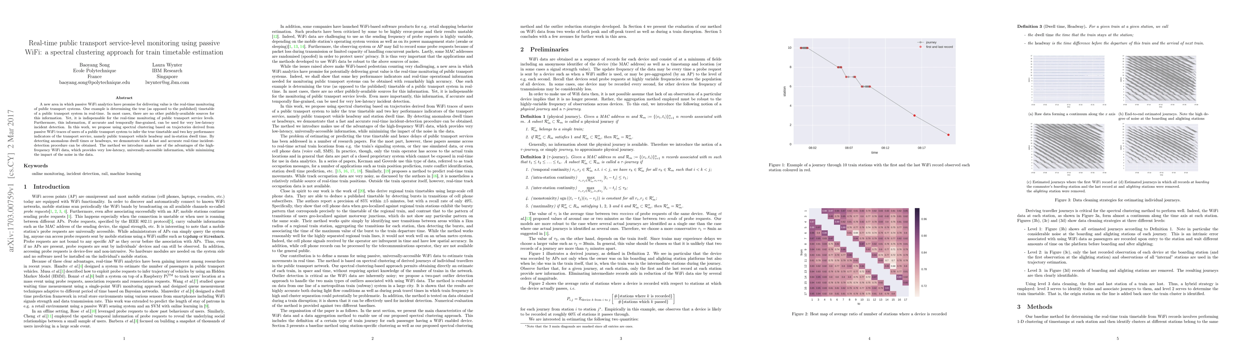 A new area in which passive WiFi analytics have promise for delivering value is the real-time monitoring of public transport systems. One example is determining the true (as opposed to the published) timetable of a public transport system in real-time. In most cases, there are no other publicly-available sources for this information. Yet, it is indispensable for the real-time monitoring of public transport service levels. Furthermore, this information, if accurate and temporally fine-grained, can be used for very low-latency incident detection. In this work, we propose using spectral clustering based on trajectories derived from passive WiFi traces of users of a public transport system to infer the true timetable and two key performance indicators of the transport service, namely public transport vehicle headway and in-station dwell time. By detecting anomalous dwell times or headways, we demonstrate that a fast and accurate real-time incident-detection procedure can be obtained. The method we introduce makes use of the advantages of the high-frequency WiFi data, which provides very low-latency, universally-accessible information, while minimizing the impact of the noise in the data.