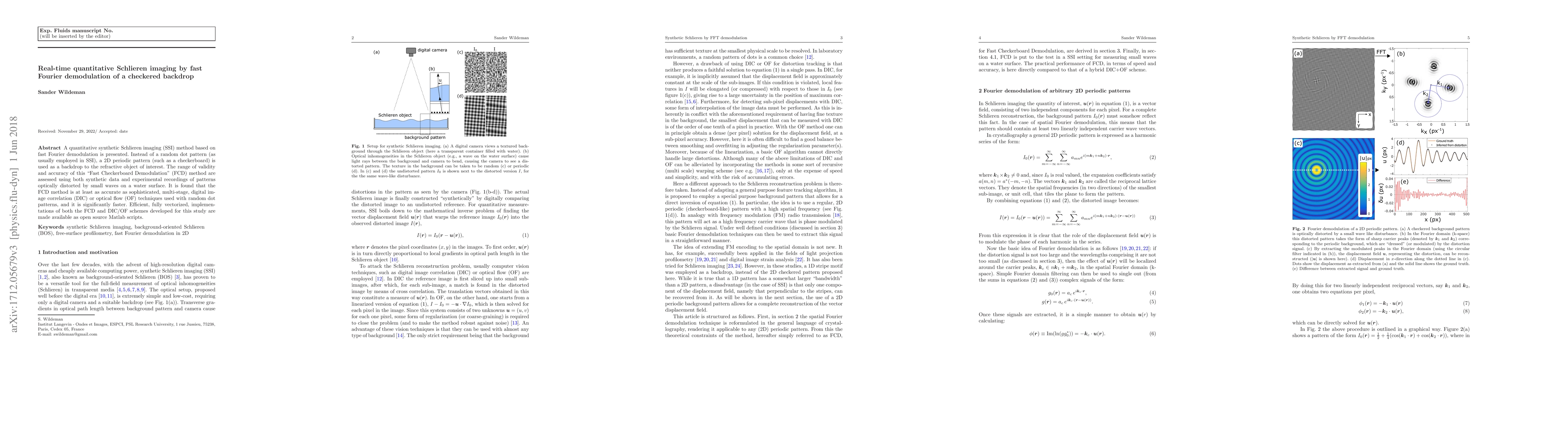 This paper introduces a fast Fourier demodulation method for real-time quantitative Schlieren imaging using a checkered backdrop instead of a random dot pattern. The "Fast Checkerboard Demodulation" (FCD) method is shown to be as accurate as digital image correlation or optical flow techniques but significantly faster, with efficient Matlab implementations provided.