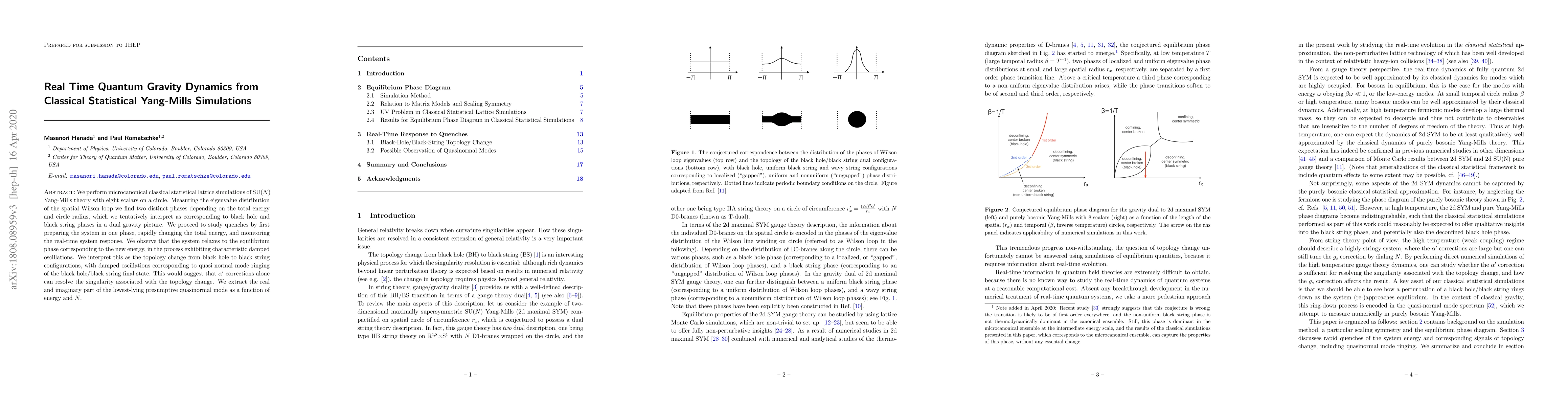 We perform microcanonical classical statistical lattice simulations of SU(N) Yang-Mills theory with eight scalars on a circle. Measuring the eigenvalue distribution of the spatial Wilson loop we find two distinct phases depending on the total energy and circle radius, which we tentatively interpret as corresponding to black hole and black string phases in a dual gravity picture. We proceed to study quenches by first preparing the system in one phase, rapidly changing the total energy, and monitoring the real-time system response. We observe that the system relaxes to the equilibrium phase corresponding to the new energy, in the process exhibiting characteristic damped oscillations. We interpret this as the topology change from black hole to black string configurations, with damped oscillations corresponding to quasi-normal mode ringing of the black hole/black string final state. This would suggest that alpha' corrections alone can resolve the singularity associated with the topology change. We extract the real and imaginary part of the lowest-lying presumptive quasinormal mode as a function of energy and N.