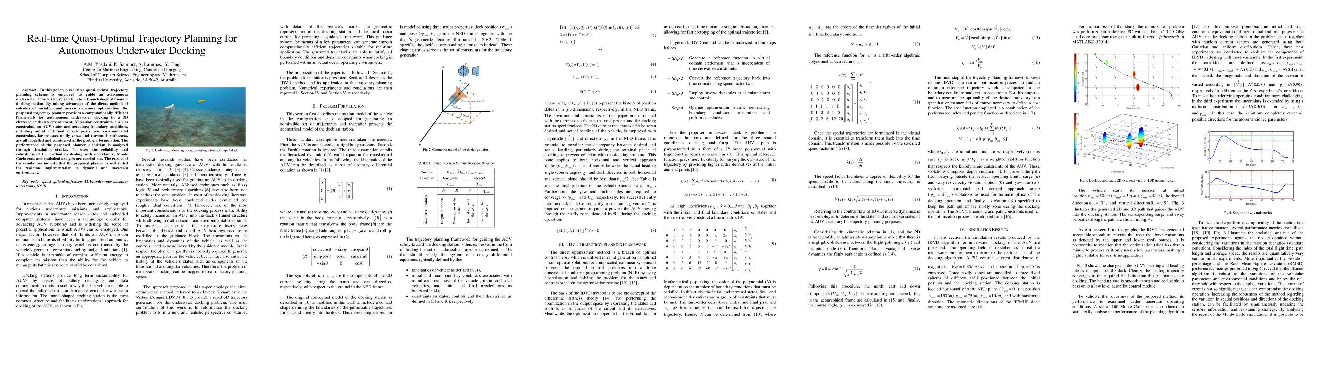 In this paper, a real-time quasi-optimal trajectory planning scheme is employed to guide an autonomous underwater vehicle (AUV) safely into a funnel-shape stationary docking station. By taking advantage of the direct method of calculus of variation and inverse dynamics optimization, the proposed trajectory planner provides a computationally efficient framework for autonomous underwater docking in a 3D cluttered undersea environment. Vehicular constraints, such as constraints on AUV states and actuators; boundary conditions, including initial and final vehicle poses; and environmental constraints, for instance no-fly zones and current disturbances, are all modelled and considered in the problem formulation. The performance of the proposed planner algorithm is analyzed through simulation studies. To show the reliability and robustness of the method in dealing with uncertainty, Monte Carlo runs and statistical analysis are carried out. The results of the simulations indicate that the proposed planner is well suited for real-time implementation in a dynamic and uncertain environment.