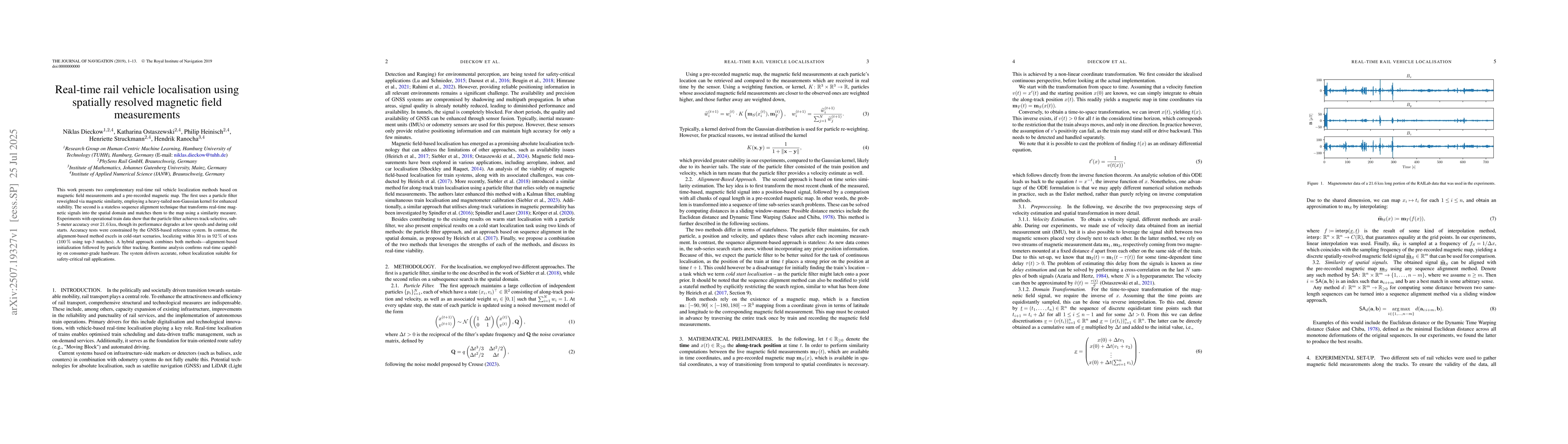 This work presents two complementary real-time rail vehicle localization methods based on magnetic field measurements and a pre-recorded magnetic map. The first uses a particle filter reweighted via magnetic similarity, employing a heavy-tailed non-Gaussian kernel for enhanced stability. The second is a stateless sequence alignment technique that transforms real-time magnetic signals into the spatial domain and matches them to the map using a similarity measure. Experiments with operational train data show that the particle filter achieves track-selective, sub-5-meter accuracy over 21.6 km, though its performance degrades at low speeds and during cold starts. Accuracy tests were constrained by the GNSS-based reference system. In contrast, the alignment-based method excels in cold-start scenarios, localizing within 30 m in 92 % of tests (100 % using top-3 matches). A hybrid approach combines both methods$\unicode{x2014}$alignment-based initialization followed by particle filter tracking. Runtime analysis confirms real-time capability on consumer-grade hardware. The system delivers accurate, robust localization suitable for safety-critical rail applications.