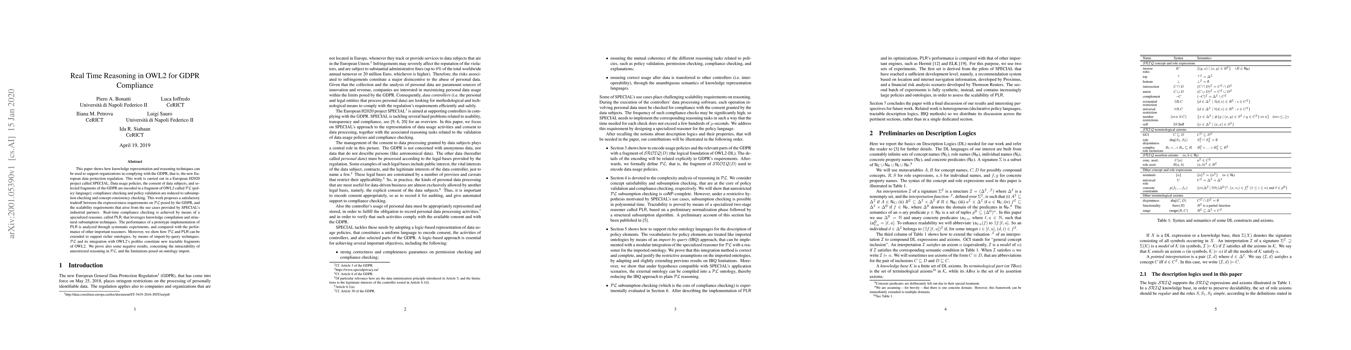 This work is crucial for organizations seeking to comply with GDPR by providing a practical method for encoding and checking data protection policies using OWL2 and a specialized reasoner, PLR, ensuring real-time compliance checking.