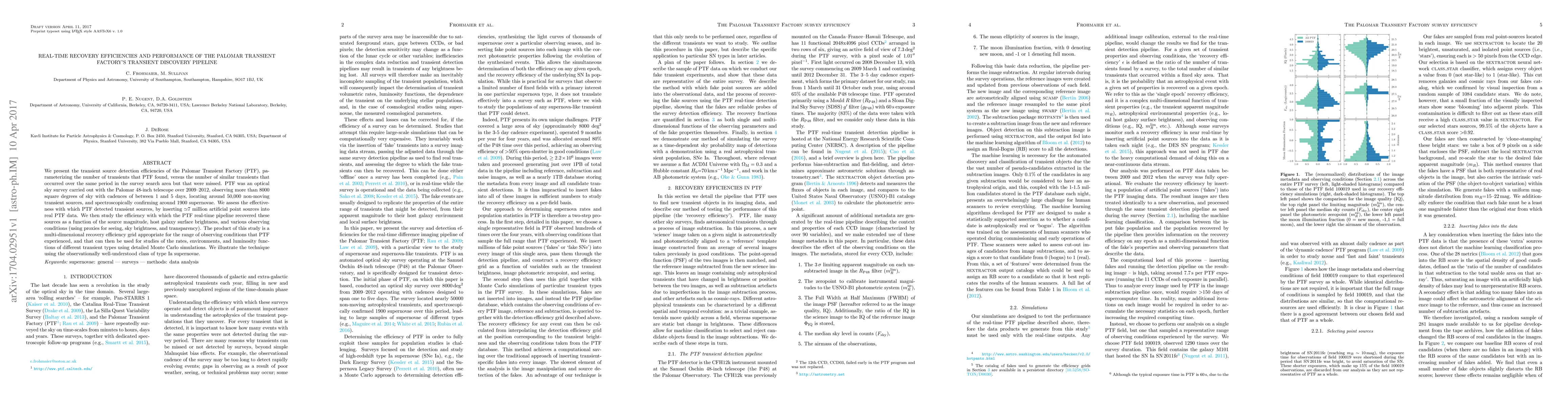This paper evaluates the Palomar Transient Factory's (PTF) transient detection efficiencies by simulating millions of artificial sources and analyzing recovery rates under various conditions. The study provides a multi-dimensional recovery efficiency grid for detailed Monte Carlo simulations of transient rates and environments.