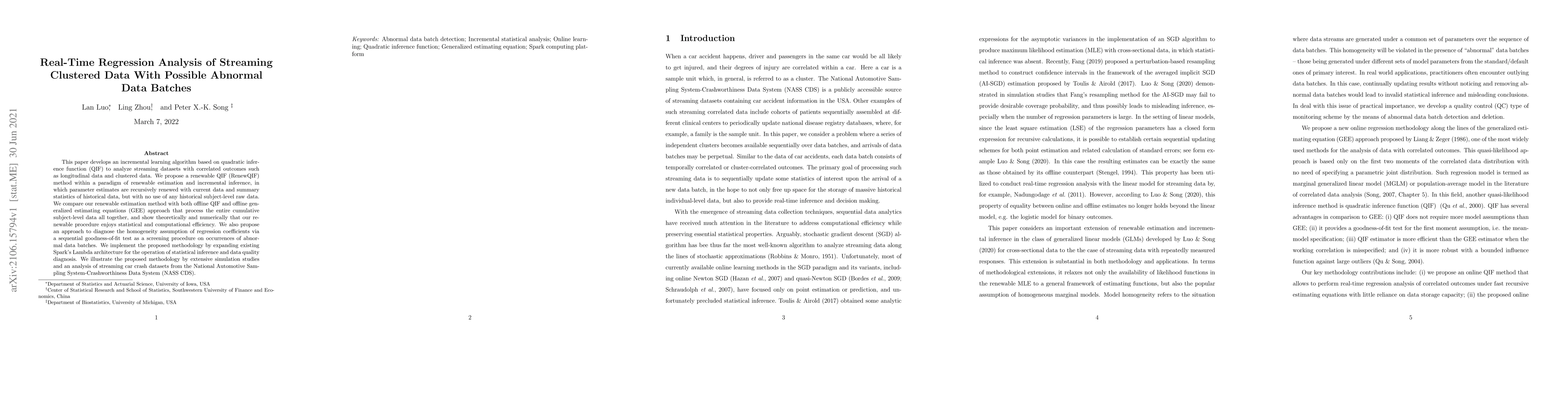 This paper introduces an incremental learning algorithm using renewable quadratic inference function (RenewQIF) for real-time analysis of streaming clustered data, demonstrating superior statistical and computational efficiency compared to offline methods. It also proposes a sequential goodness-of-fit test to detect abnormal data batches, implemented via an expanded Spark architecture.
