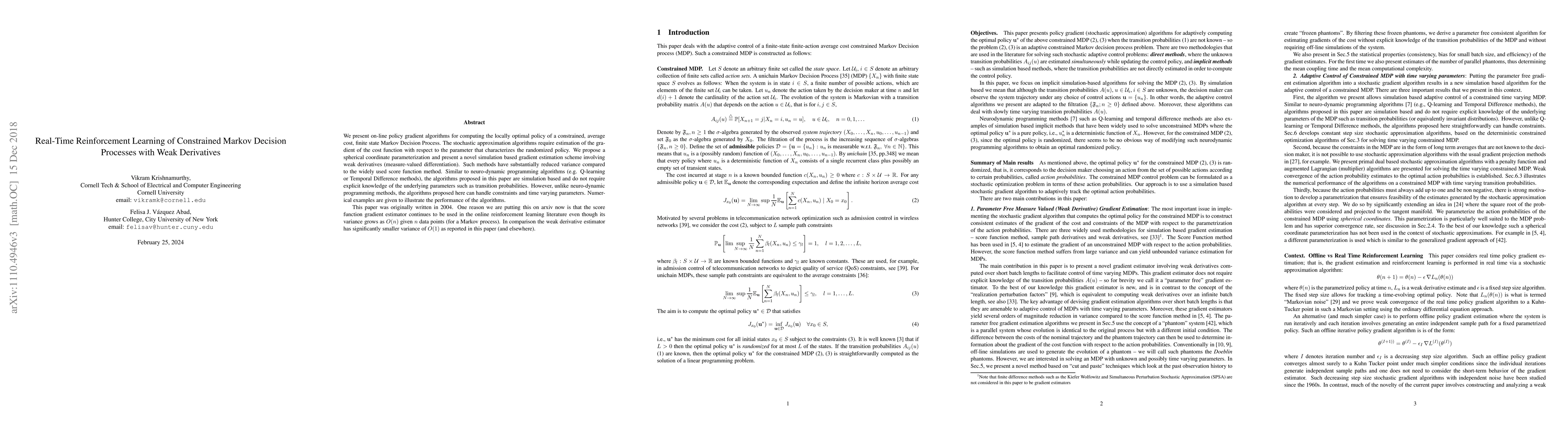 We present on-line policy gradient algorithms for computing the locally optimal policy of a constrained, average cost, finite state Markov Decision Process. The stochastic approximation algorithms require estimation of the gradient of the cost function with respect to the parameter that characterizes the randomized policy. We propose a spherical coordinate parametrization and present a novel simulation based gradient estimation scheme involving weak derivatives (measure-valued differentiation). Such methods have substantially reduced variance compared to the widely used score function method. Similar to neuro-dynamic programming algorithms (e.g. Q-learning or Temporal Difference methods), the algorithms proposed in this paper are simulation based and do not require explicit knowledge of the underlying parameters such as transition probabilities. However, unlike neuro-dynamic programming methods, the algorithms proposed here can handle constraints and time varying parameters. Numerical examples are given to illustrate the performance of the algorithms. This paper was originally written in 2004. One reason we are putting this on arxiv now is that the score function gradient estimator continues to be used in the online reinforcement learning literature even though its variance grows as $O(n)$ given $n$ data points (for a Markov process). In comparison the weak derivative estimator has significantly smaller variance of $O(1)$ as reported in this paper (and elsewhere).